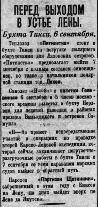 ЛЯХОВСКАЯ ЭКСПЕДИЦИЯ ДОСТАВЛЕНА НА МЕСТО.Бухта Тикси, 14 сентября.Теплоход «Пятилетка» благополучно доставил на Ляховские острова весь состав экспедиции, продовольственные запасы и научное оборудование.