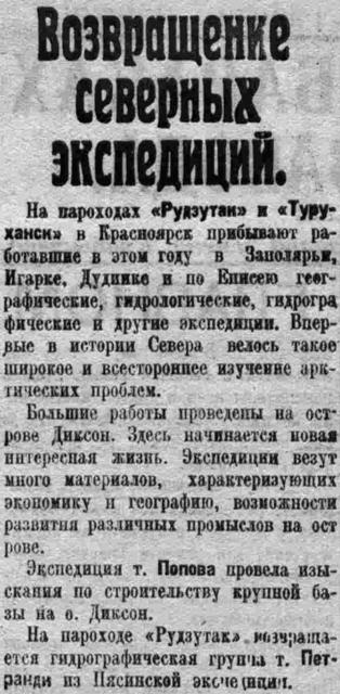 13 сентября в 4 часа дня окончена выгрузка, теплоход вышел в обратный рейс в Тикси.