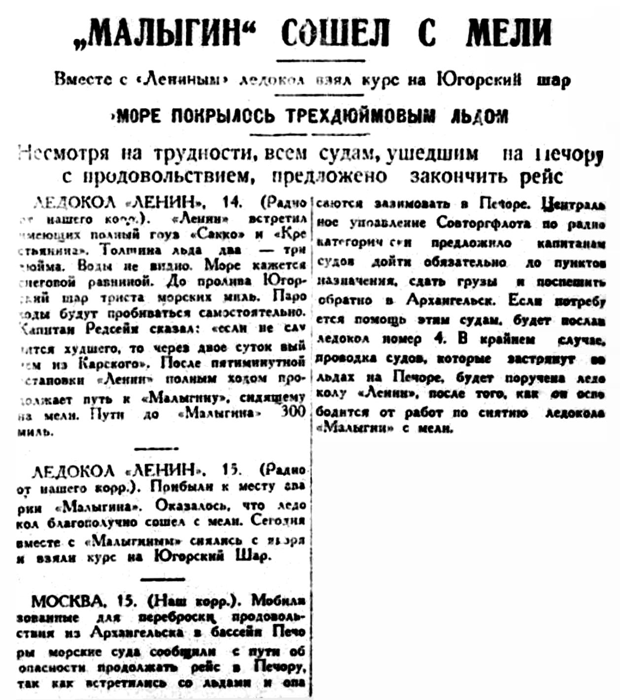 МОСКВА. 15. (Наш корр.). Мобилизованные для переброски продовольствия из Архангельска в бассейн Печоры морские суда сообщили с пути об опасности продолжать рейс в Печору, так как встретились со льдами и опасаются зазимовать в Печоре. Центральное управление Совторгфлота по радио категорически предложило капитанам судов дойти обязательно до пунктов назначения, сдать грузы и поспешить обратно в Архангельск. Если потребуется помощь этим судам, будет послан ледокол номер 4. В крайнем случае, проводка судов, которые застрянут во льдах на Печоре, будет поручена ледоколу "Ленин", после того, как он освободится от работ по снятию ледокола "Малыгин" с мели.