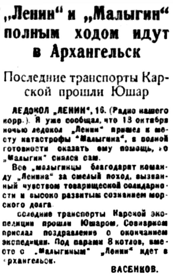 ЛЕДОКОЛ "ЛЕНИН". 15. (Радио нашего корр.) Я уже сообщал, что 13 октября ночью ледокол "Ленин" пришел к месту катастрофы "Малыгина", в полной готовности оказать ему помощь, но "Малыгин" снялся сам.