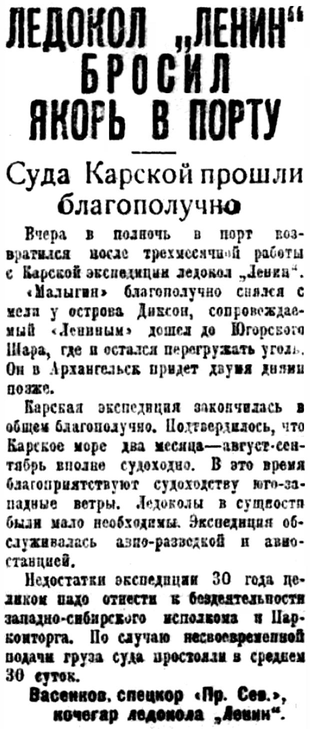 Карская экспедиция закончилась в общем благополучно. Подтвердилось, что Карское море два месяца — август-сентябрь вполне судоходно. В это время благоприятствуют судоходству юго-западные ветры. Ледоколы в сущности были мало необходимы. Экспедиция обслуживалась авио-разведкой и авио-станцией.