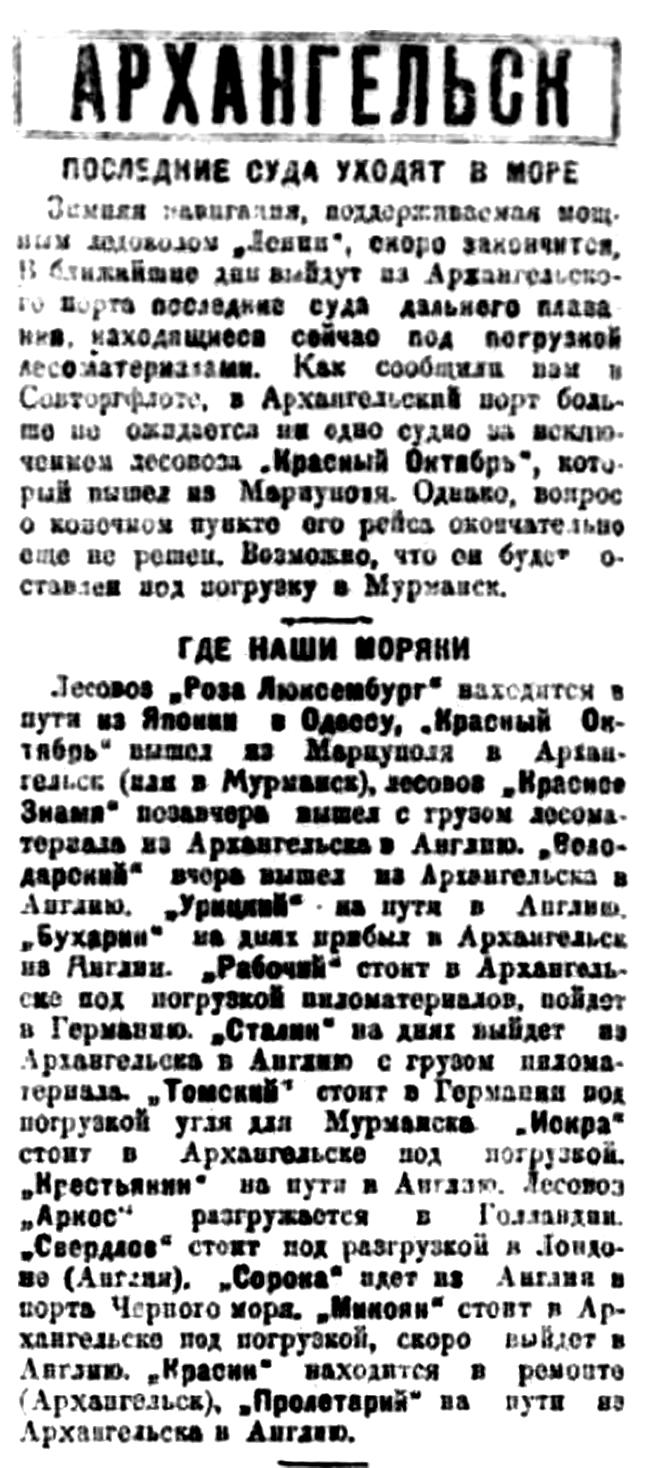 Лесовоз "Роза Люксембург" находится в пути из Японии в Одессу, "Красный Октябрь" вышел из Мариуполя в Архангельск (или в Мурманск), лесовоз "Красное Знамя" позавчера вышел с грузом лесоматериала из Архангельска в Англию. "Володарский" вчера вышел из Архангельска в Англию. "Урицкий" на пути в Англию. "Бухарин" на днях прибыл в Архангельск из Англии. "Рабочий" стоит в Архангельске под погрузкой пиломатериалов, пойдет в Германию. "Сталин" на днях выйдет из Архангельска в Англию с грузом пиломатериала. "Томский" стоит в Германии под погрузкой угля для Мурманска. "Искра" стоит в Архангельске под погрузкой. "Крестьянин" на пути в Англию. Лесовоз "Аркос" разгружается в Голландии. "Свердлов" стоит под разгрузкой и Лондоне (Англия). "Сорока" идет из Англии и порта Черного моря. "Микоян" стоит и Архангельске под погрузкой, скоро выйдет в Англию. "Красин" находится в ремонте (Архангельск), "Пролетарий" на пути из Архангельска в Англию.