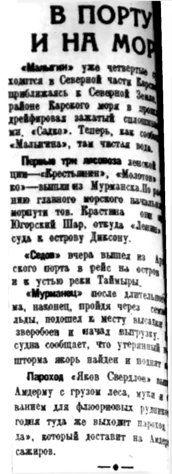 Первые три лесовоза ленской экспедиции — "Крестьянин", "Молотов" и "Сакко" — вышли из Мурманска. По решению главного морского начальника Севморпути тов. Крастина они идут в Югорский Шар, откуда "Ленин" поведет суда к острову Диксону.