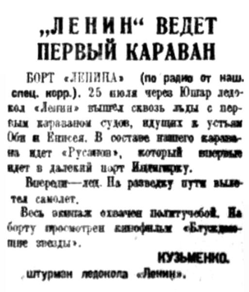 БОРТ "ЛЕНИНА" (по радио от наш. спец. корр). 25 июля через Юшар ледокол "Ленин" вышел сквозь льды с первым караваном судов, идущих к устьям Оби и Енисея. В составе нашего каравана идет "Русанов", который впервые идет в далекий порт Индигирку.