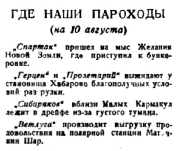 "Седов" и "Русанов" провели к острову Русский четыре парохода — "Искра" и "Крестьянин", идущие во Владивосток. "Ванцетти" и "Сакко", направляющиеся в устье Лены. "Седов" разгружается на острове Русском, а "Русанов" и лесовозы продолжают путь к мысу Челюскин.