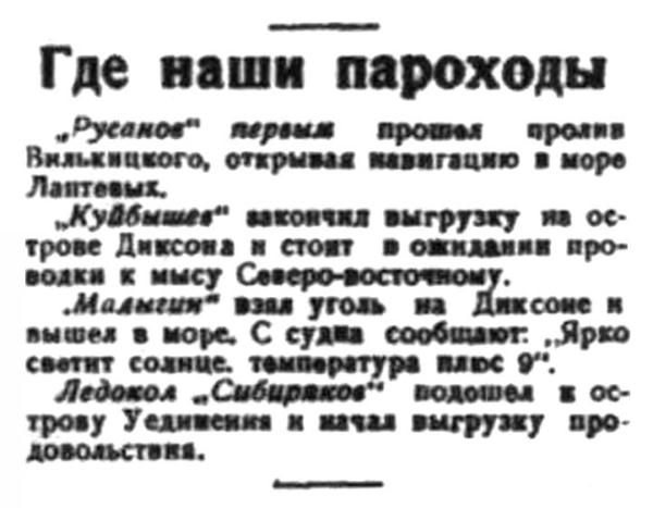 БОРТ "СЕДОВА", 6 (по радио от наш. спец. корр.) Сегодня в 9 часов утра, сопровождая караван судов Ленско-Карской экспедиции, встретились около острова Макарова с "Ермаком". Сделав разведку в пролив Вилькицкого, "Ермак" принял от "Седова" караван для сопровождения его в море Лаптевых. Путь через пролив Вилькицкого — труднейший участок Северного морского пути — преграждает десятибалльный сплошной лед, местами достигающий полутора метров толщины.