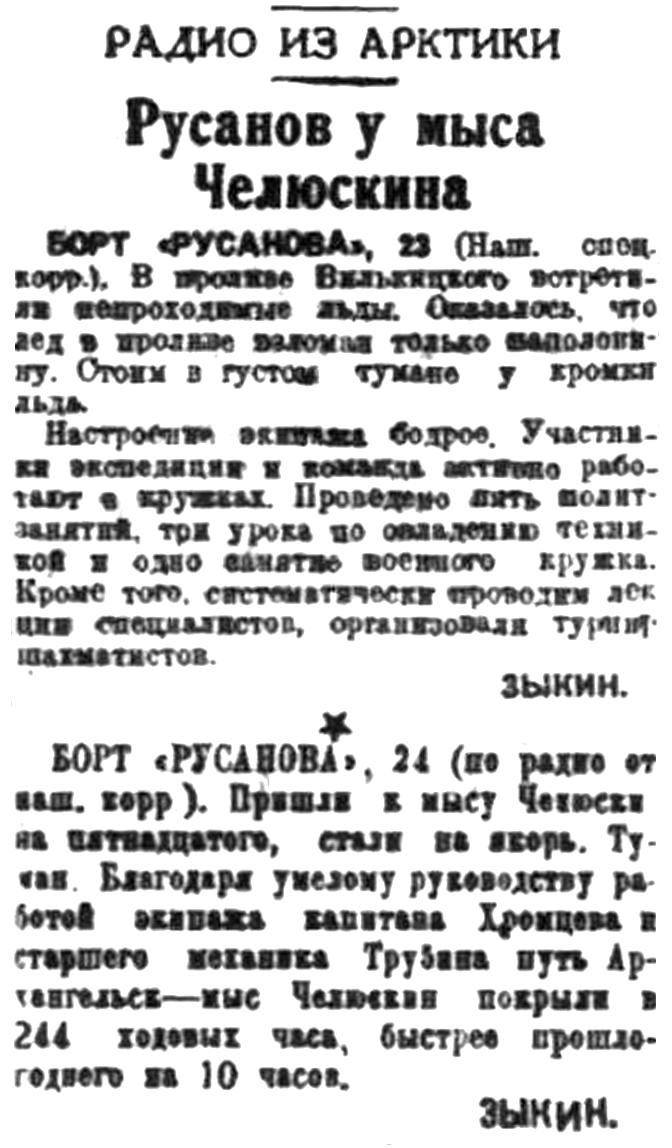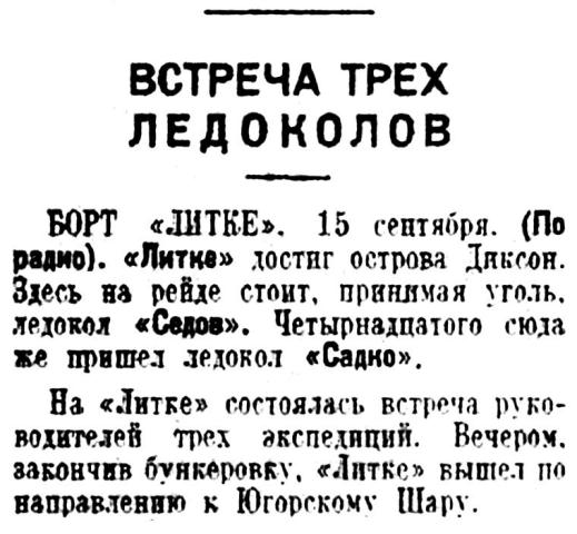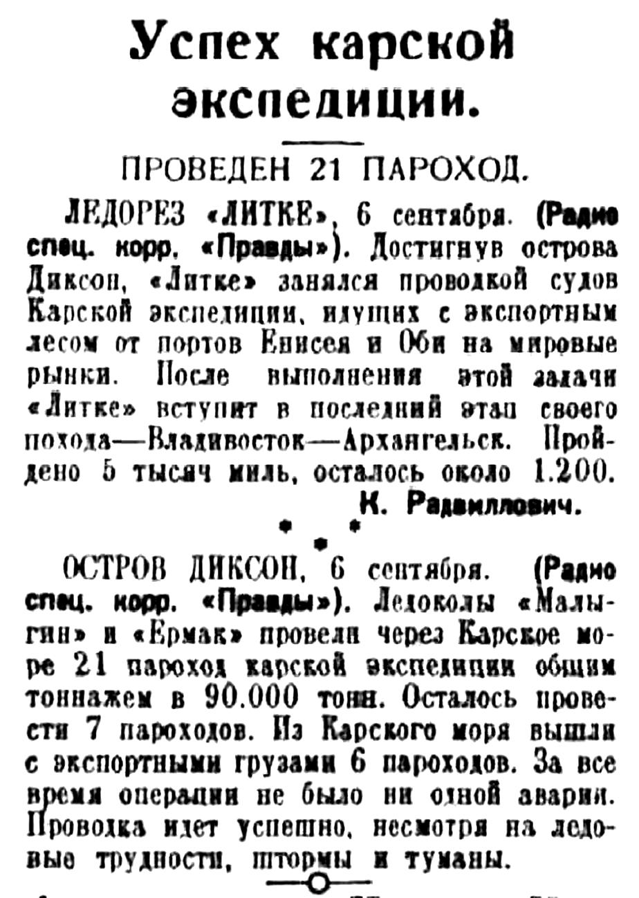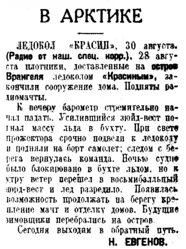 «Красин» достиг острова Врангеля и снял оттуда зимовщиков, бессменно работавших на острове 5 лет. Попутно «Красин» провел в районе о. Врангеля (северо-западнее его) значительную научную работу. Итоги этой работы вместе с материалами, добытыми «Сибиряковым» и «Литке», а также экспедицией «Челюскина» в районах несколько южнее о Врангеля, дадут нам ясное представление о навигационном и ледовом режиме этого труднейшего участка Северного морского пути.
