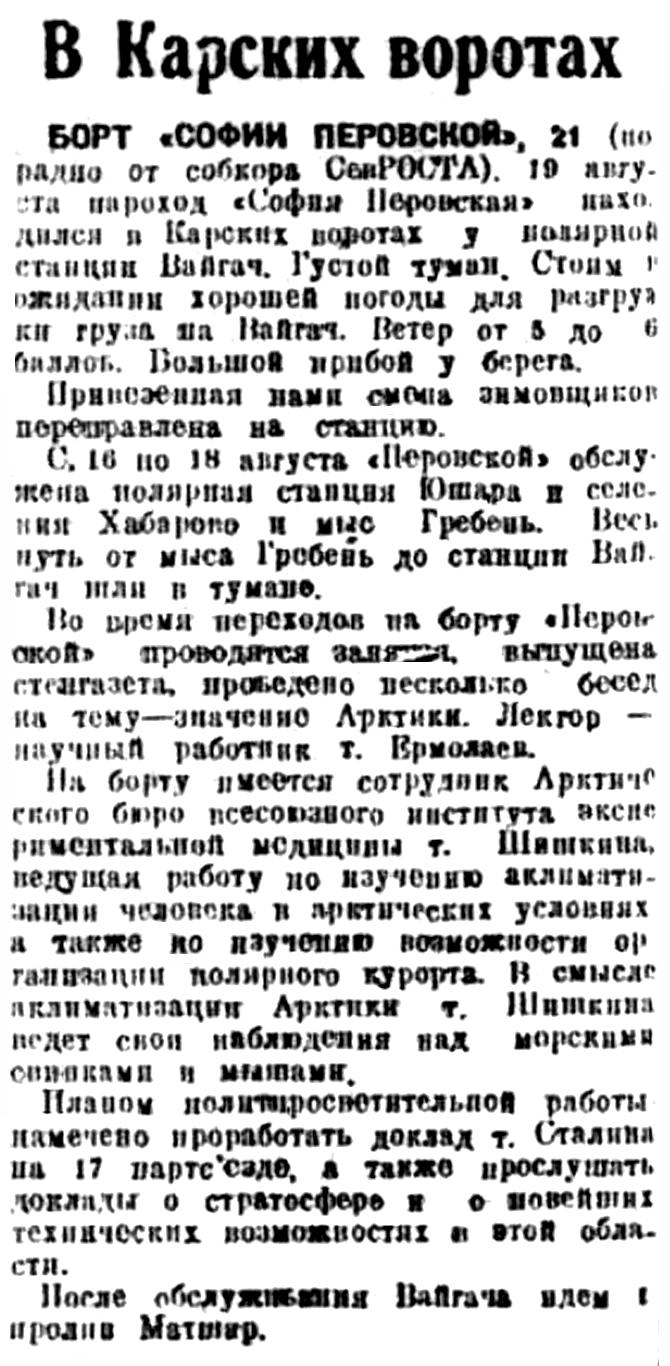 Располагая героической полярной авиацией, мощной сетью научных станций и раций на всех участках Северного морского пути и широко развернув разведки богатств далекого Приполярья, мы имеем налицо все необходимые, предпосылки для выполнения в кратчайший срок новых заданий, поставленных правительством перед Главным управлением Северного морского пути в историческом решении о развитии северного хозяйства.