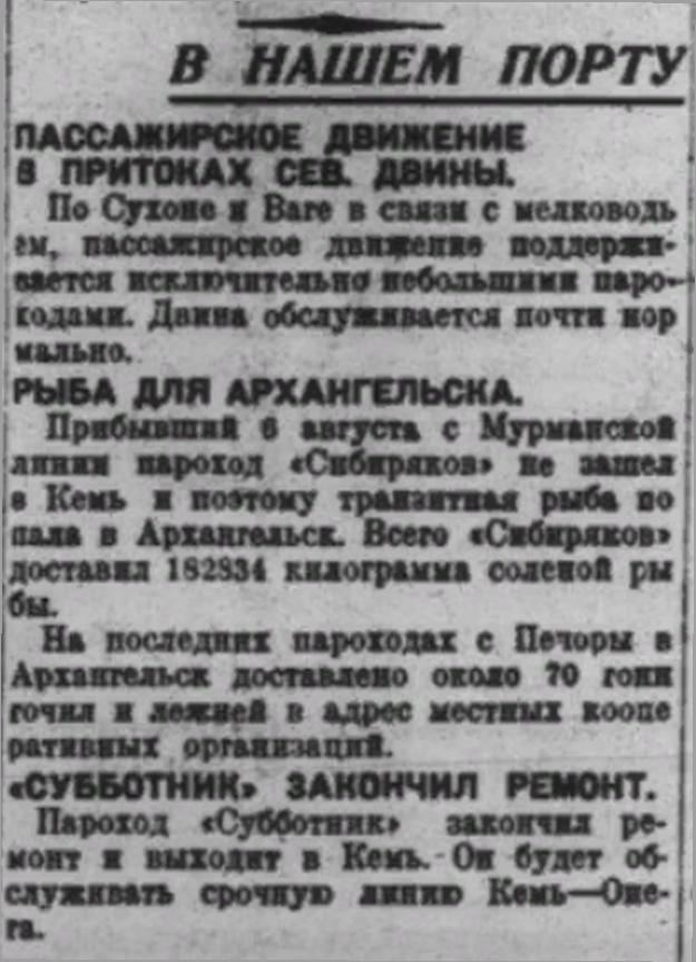 На днях пароход "Субботник" и "Революция" кончают ремонт и становятся под груз: первый на срочную линию Кемь-Онега, а "Революция" — на Новую Землю.