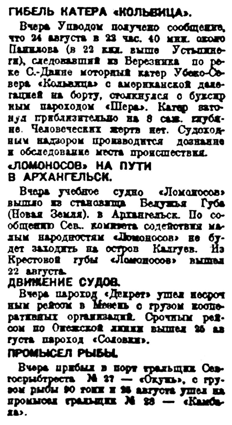 Вчера Упводом получено сообщение, что 24 августа в 22 час. 40 мин. около Панилова (в 22 кил. выше Устьпинеги), следовавший из Березника по реке С.-Двине моторный катер Убеко-Севера "Кольвица" с американской делегацией на борту, столкнулся о буксирным пароходом "Шера". Катер затонул приблизительно на 8 саж. глубине. Человеческих жертв нет. Судоходным надзором производится дознание и обследование места происшествия.