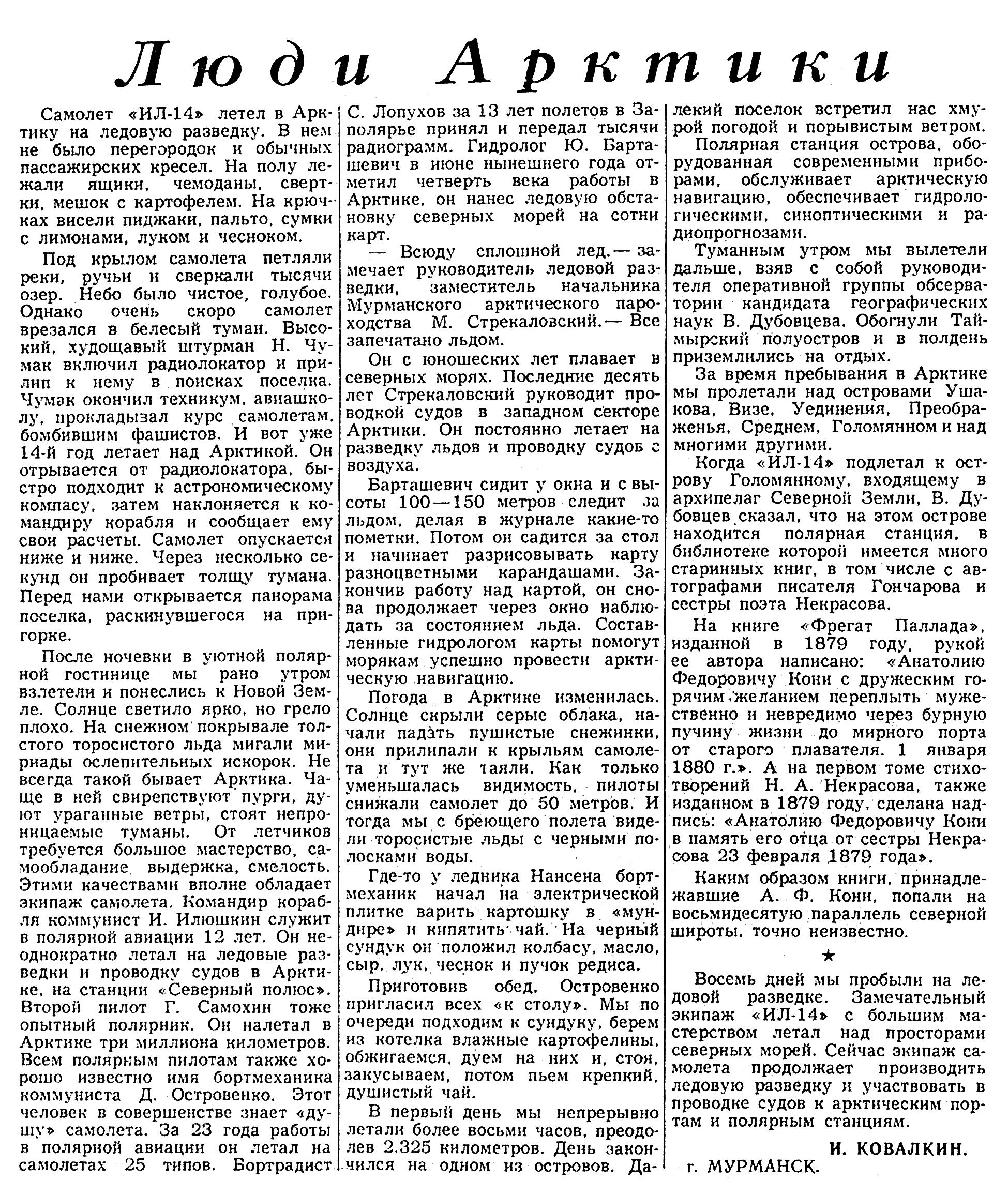 Восемь дней мы пробыли на ледовой разведке. Замечательный экипаж «ИЛ-14» с большим мастерством летал над просторами северных морей. Сейчас экипаж самолета продолжает производить ледовую разведку и участвовать в проводке судов к арктическим портам и полярным станциям.