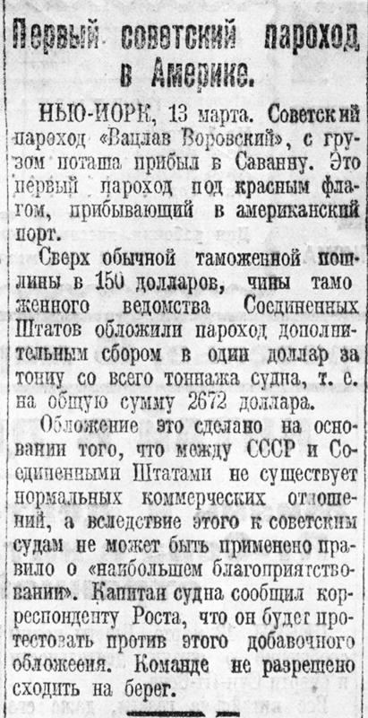 НЬЮ-ЙОРК, 13 марта. Советский пароход «Вацлав Воровский», с грузом поташа прибыл в Саванну. Это первый пароход под красным флагом, прибывающий в американский порт.