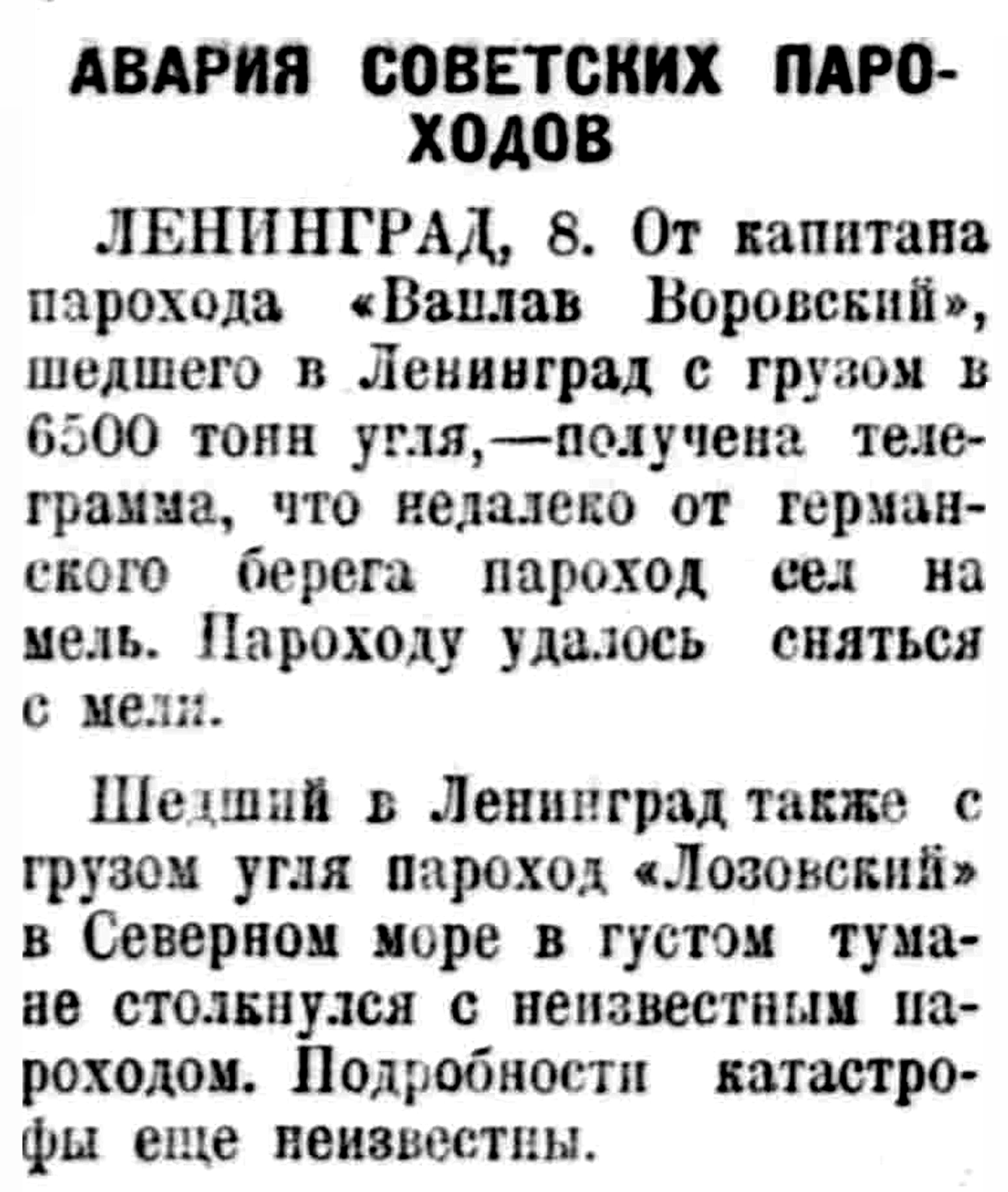 "Вацлав Воровский", проходя пятого декабря вечером между плавучими маяками Эльбы в Северном море, сел на мель. В час ночи он своими силами снялся и ожидается в Ленинграде 12 декабря. Причина аварии — неумелые немецкие лоцманы.