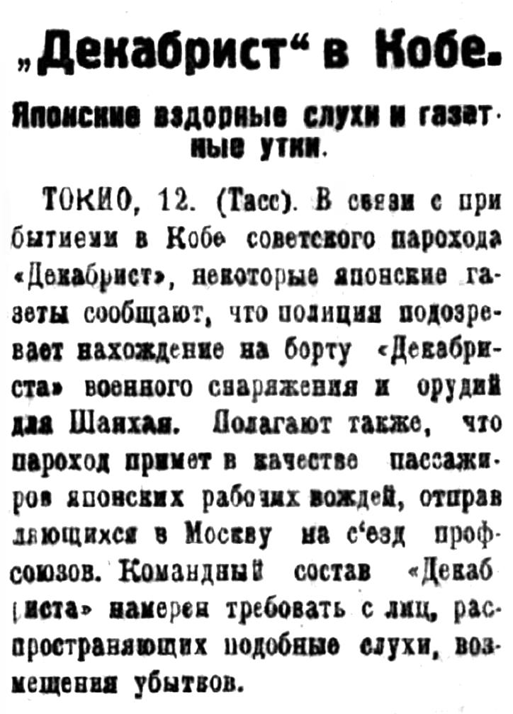 ТОКИО, 12. (Тасс). В связи с прибытием в Кобе советского парохода "Декабрист", некоторые японские газеты сообщают, что полиция подозревает нахождение на борту "Декабриста" военного снаряжения и орудий для Шанхая. Полагают также, что пароход примет в качестве пассажиров японских рабочих вождей, отправляющихся в Москву ва съезд профсоюзов. Командный состав "Декабриста" намерен требовать с лиц, распространяющих подобные слухи, возмещения убытков.