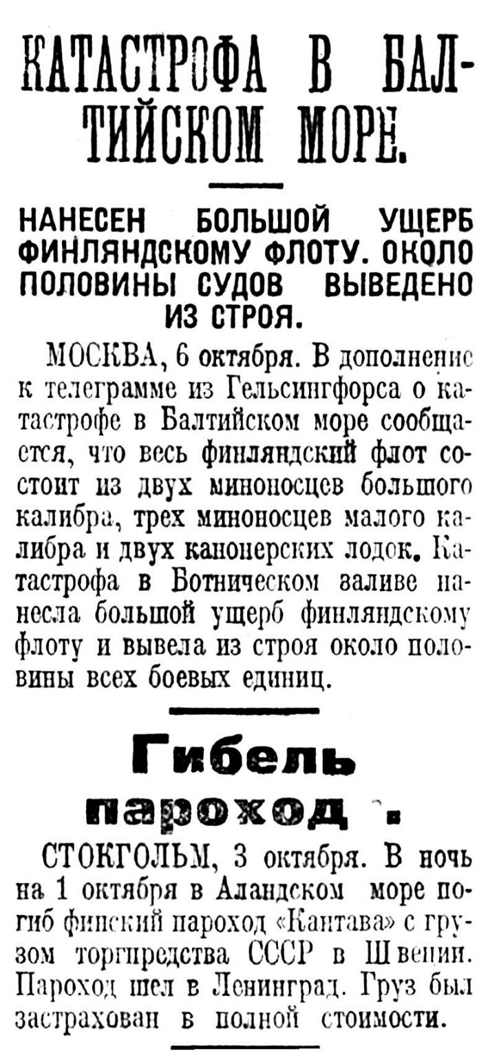 МОСКВА, 6 октября. В дополнение к телеграмме из Гельсингфорса о катастрофе в Балтийском море сообщается, что весь финляндский флот состоит из двух миноносцев большого калибра, трех миноносцев малого калибра и двух канонерских лодок. Катастрофа в Ботническом заливе нанесла большой ущерб финляндскому флоту и вывела из строя около половины всех боевых единиц.