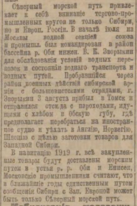 Северный морское путь привлекает к себе внимание торгово-промышленных кругов не только Сибири, но и Европ. России. В начале июля из Москвы водной секцией союза и промышл. был командирован в район бассейна р. Оби инжен. В. К. Зворыкин для обследования условий водных перевозок и состояний водного транспорта и водных путей. Пробравшийся через район военных действий сибирской армии с большевистскими отрядами, г. Зворыкин 3 августа прибыл в Томск и отправился отсюда с пароходами, идущими с хлебом в Обскую губу, где предполагает перебраться на иностранное судно и уехать в Англию, Норвегию, Швецию с целью заготовки товаров для Западной Сибири.