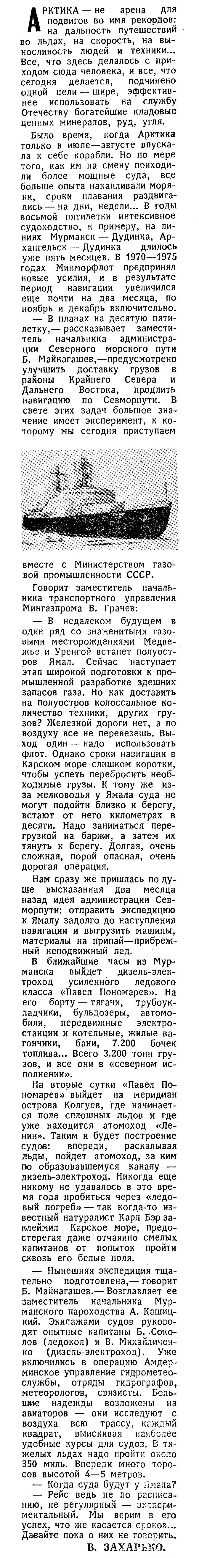— В планах на десятую пятилетку, — рассказывает заместитель начальника администрации Северного морского пути Б. Майнагашев, — предусмотрено улучшить доставку грузов в районы Крайнего Севера и Дальнего Востока, продлить навигацию по Севморпути. В свете этих задач большое значение имеет эксперимент, к которому мы сегодня приступаем