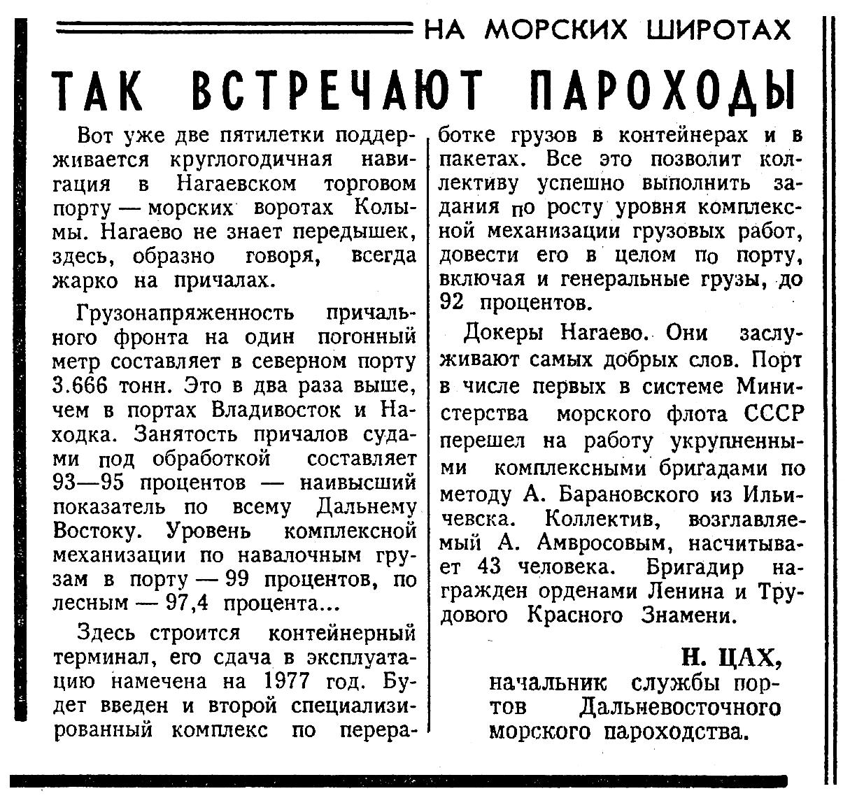 Докеры Нагаево. Они заслуживают самых добрых слов. Порт в числе первых в системе Министерства морского флота СССР перешел на работу укрупненными комплексными бригадами по методу А. Барановского из Ильичевска. Коллектив, возглавляемый А. Амвросовым, насчитывает 43 человека. Бригадир награжден орденами Ленина и Трудового Красного Знамени.