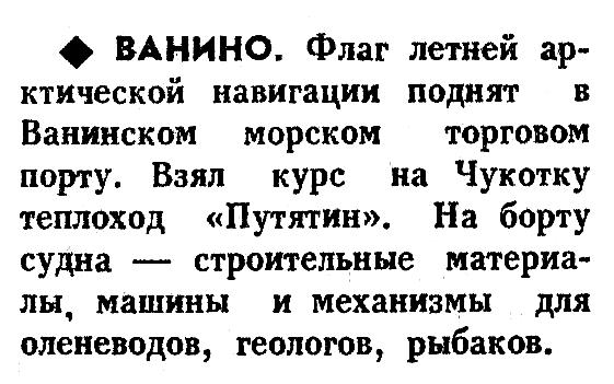 ♦ ВАНИНО. Флаг летней арктической навигации поднят в Ванинском морском торговом порту. Взял курс на Чукотку теплоход «Путятин». На борту судна — строительные материалы, машины и механизмы для оленеводов, геологов, рыбаков.