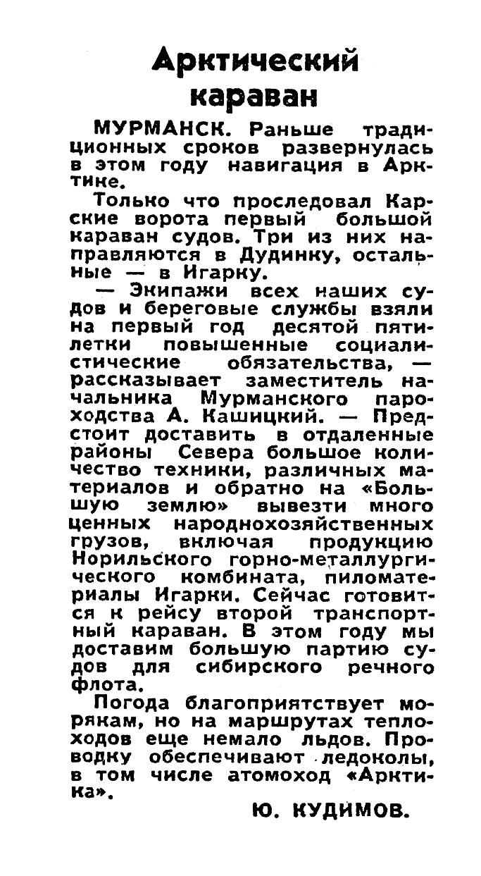 — Экипажи всех наших судов и береговые службы взяли на первый год десятой пятилетки повышенные социалистические обязательства, — рассказывает заместитель начальника Мурманского пароходства А. Кашицкий. — Предстоит доставить в отдаленные районы Севера большое количество техники, различных материалов и обратно на «Большую землю» вывезти много ценных народнохозяйственных грузов, включая продукцию Норильского горно-металлургического комбината, пиломатериалы Игарки. Сейчас готовится к рейсу второй транспортный караван. В этом году мы доставим большую партию судов для сибирского речного флота.