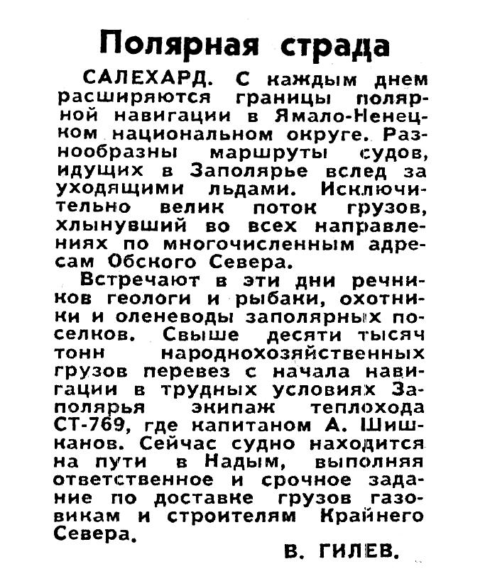 Встречают в эти дни речников геологи и рыбаки, охотники и оленеводы заполярных поселков. Свыше десяти тысяч тонн народнохозяйственных грузов перевез с начала навигации в трудных условиях Заполярья экипаж теплохода СТ-769, где капитаном А. Шишканов. Сейчас судно находится на пути в Надым, выполняя ответственное и срочное задание по доставке грузов газовикам и строителям Крайнего Севера.