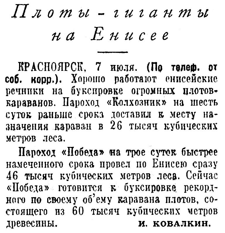Пароход «Победа» на трое суток быстрее намеченного срока провел по Енисею сразу 46 тысяч кубических метров леса. Сейчас «Победа» готовится к буксировке рекордного по своему об’ему каравана плотов, состоящего из 60 тысяч кубических метров древесины.