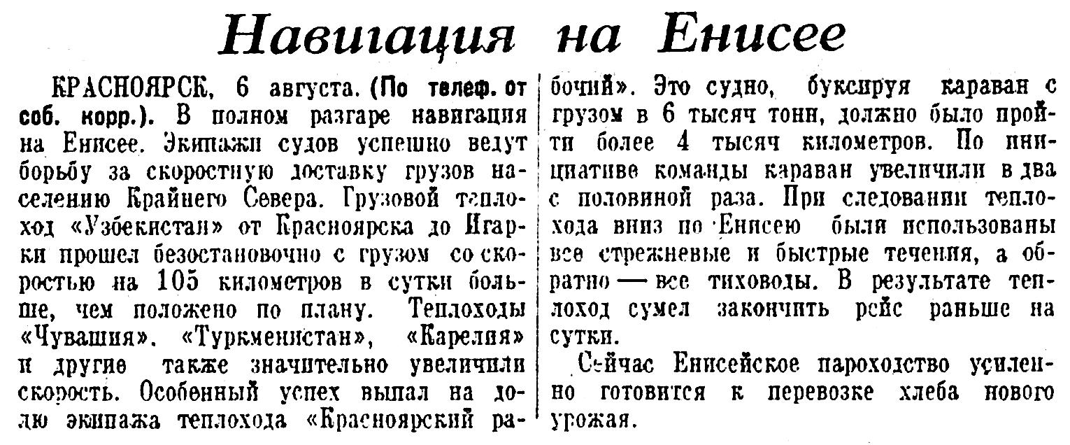 КРАСНОЯРСК, 6 августа. (По телеф. от соб. корр.). В полном разгаре навигация на Енисее. Экипажи судов успешно ведут борьбу за скоростную доставку грузов населению Крайнего Севера. Грузовой теплоход «Узбекистан» от Красноярска до Игарки прошел безостановочно с грузом со скоростью на 105 километров в сутки больше, чем положено по плану. Теплоходы «Чувашия», «Туркменистан», «Карелия» и другие также значительно увеличили скорость. Особенный успех выпал на долю экипажа теплохода «Красноярский рабочий». Это судно, буксируя караван с грузом в 6 тысяч тонн, должно было пройти более 4 тысяч километров. По инициативе команды караван увеличили в два с половиной раза. При следовании теплохода вниз по Енисею были использованы все стрежневые и быстрые течения, а обратно — все тиховоды. В результате теплоход сумел закончить рейс раньше на сутки.