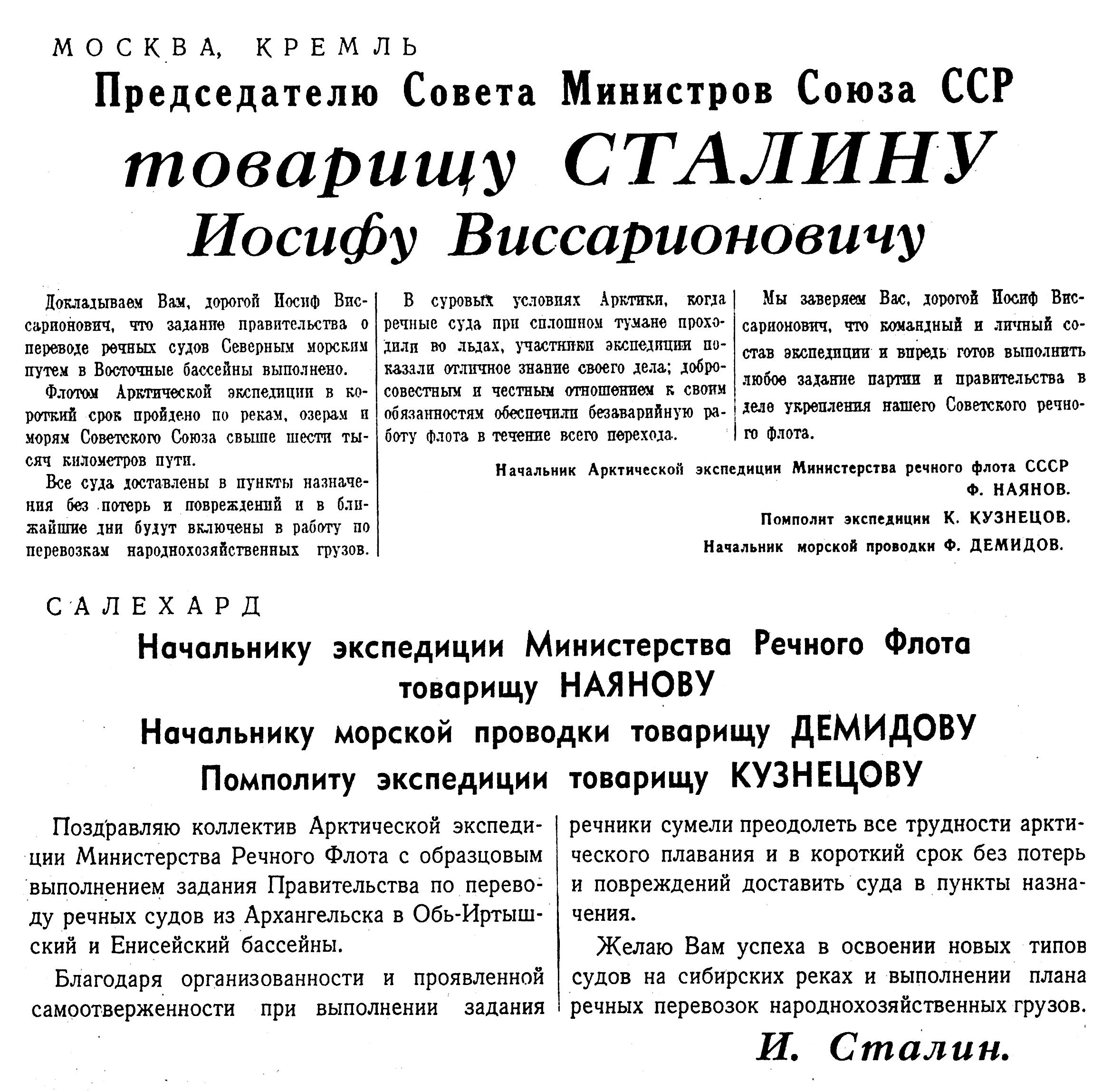 Поздравляю коллектив Арктической экспедиции Министерства Речного Флота с образцовым выполнением задания Правительства по переводу речных судов из Архангельска в Обь-Иртышский и Енисейский бассейны.