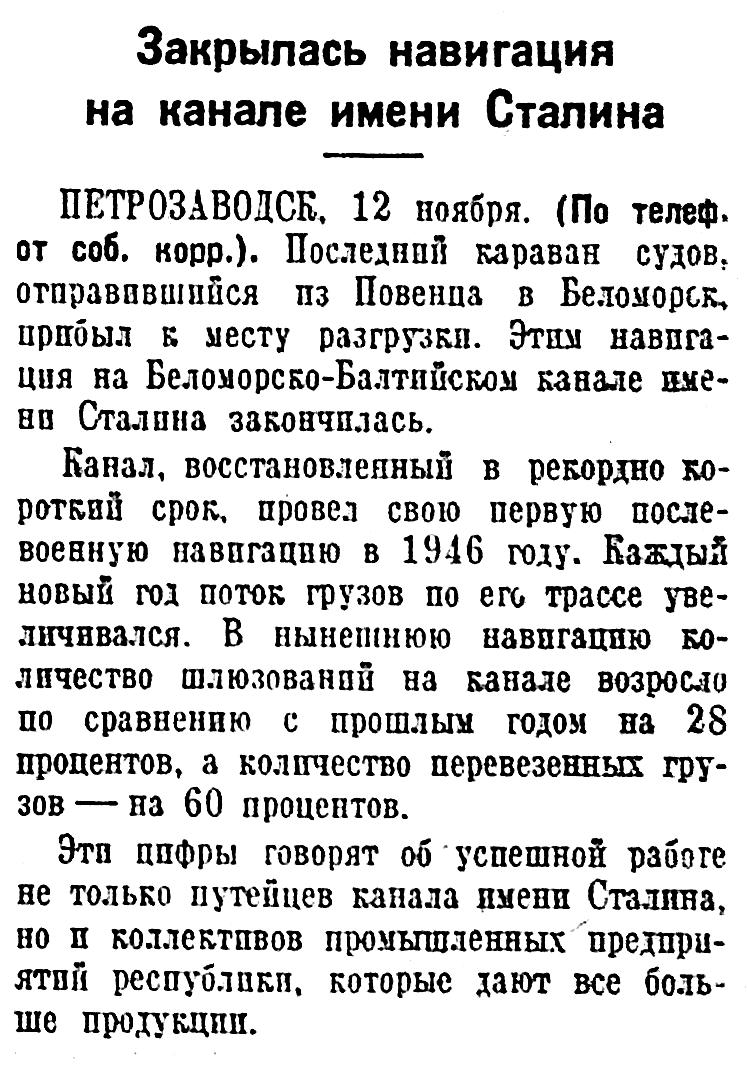 Канал, восстановленный в рекордно короткий срок, провел свою первую послевоенную навигацию в 1946 году. Каждый новый год поток грузов по его трассе увеличивался. В нынешнюю навигацию количество шлюзований на канале возросло по сравнению с прошлым годом на 28 процентов, а количество перевезенных грузов— на 60 процентов.