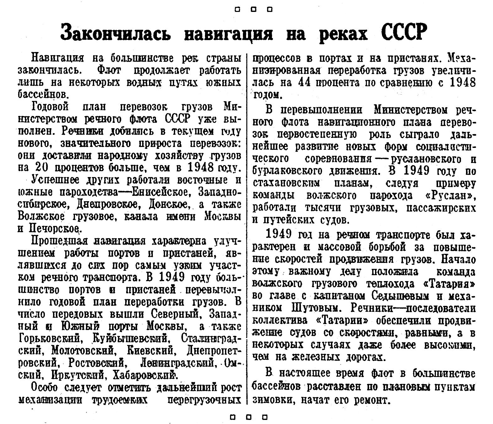 Прошедшая навигация характерна улучшением работы портов п пристаней, являвшихся до сих пор самым узким участком речного транспорта. В 1949 году большинство портов в пристаней перевыполнило годовой план переработки грузов. В число передовых вышли Северный, Западный и Южный порты Москвы, а также Горьковский, Куйбышевский, Сталинградский, Молотовский, Киевский, Днепропетровский, Ростовский, Ленинградский, Омский, Иркутский, Хабаровский.