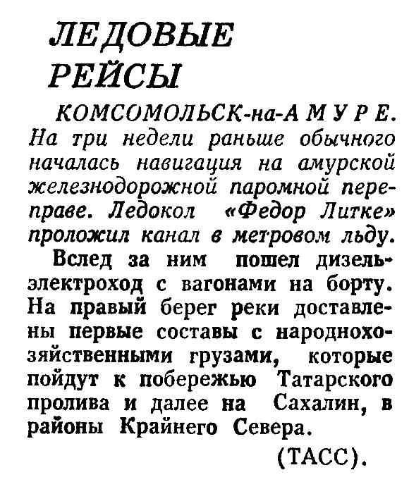 Вслед за ним пошел дизель-электроход с вагонами на борту. На правый берег реки доставлены первые составы с народнохозяйственными грузами, которые пойдут к побережью Татарского пролива и далее на Сахалин, в районы Крайнего Севера.