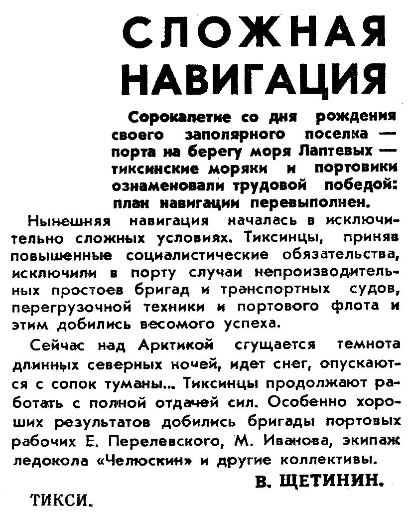 Нынешняя навигация началась в исключительно сложных условиях. Тиксинцы, приняв повышенные социалистические обязательства, исключили в порту случаи непроизводительных простоев бригад и транспортных судов, перегрузочной техники и портового флота и этим добились весомого успеха.