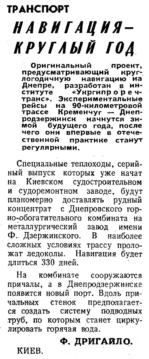 Оригинальный проект, предусматривающий круглогодичную навигацию на Днепре, разработан в институте «Укргипроречтранс». Экспериментальные рейсы на 90-километровой трассе Кременчуг — Днепродзержинск начнутся зимой будущего года, после чего они впервые в отечественной практике станут регулярными.
