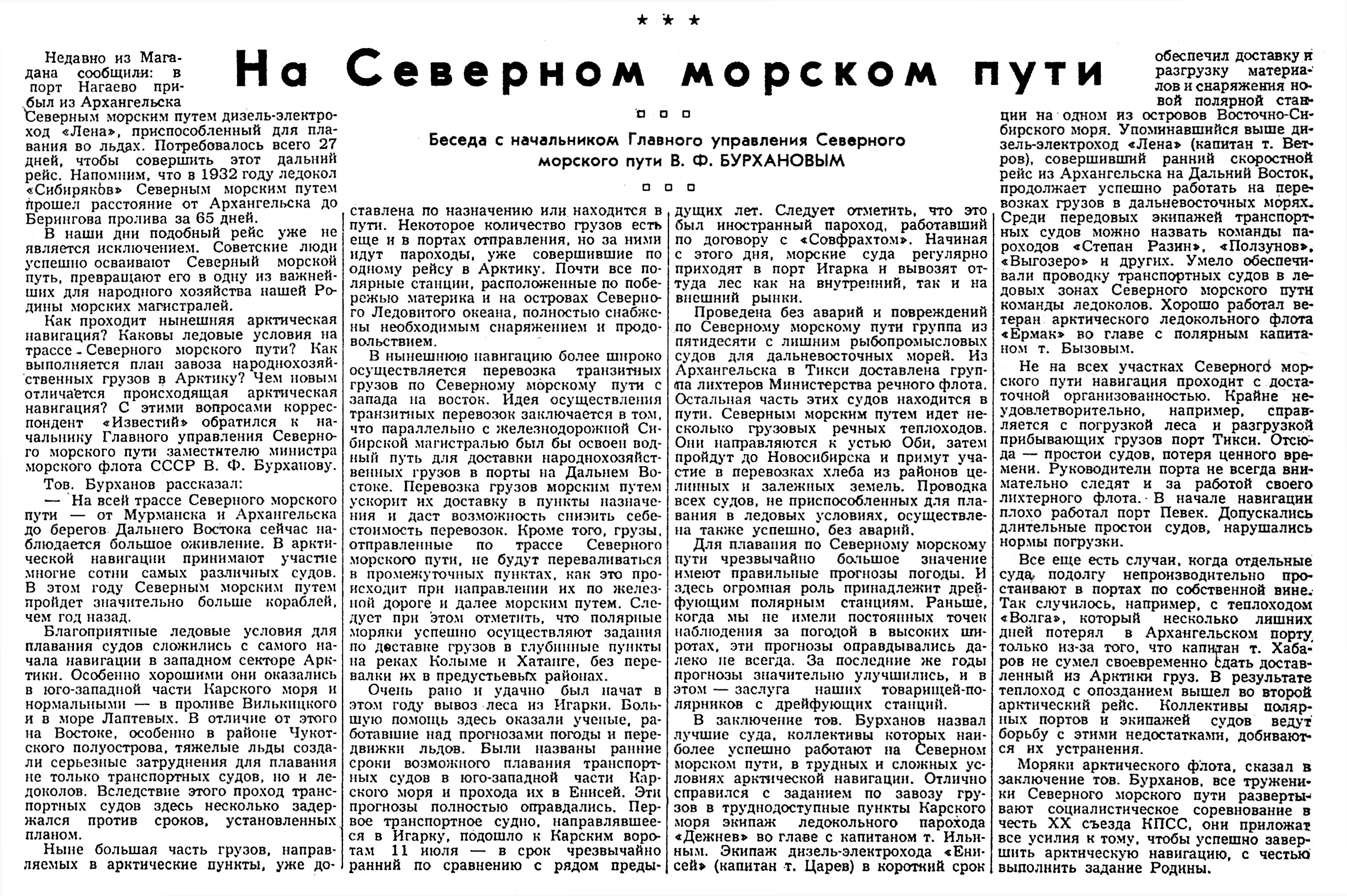 Как проходит нынешняя арктическая навигация? Каковы ледовые условия на трассе Северного морского пути? Как выполняется план завоза народнохозяйственных грузов в Арктику? Чем новым отличается происходящая арктическая навигация? С этими вопросами корреспондент «Известий» обратился к начальнику Главного управления Северного морского пути заместителю министра морского флота СССР В. Ф. Бурханову.