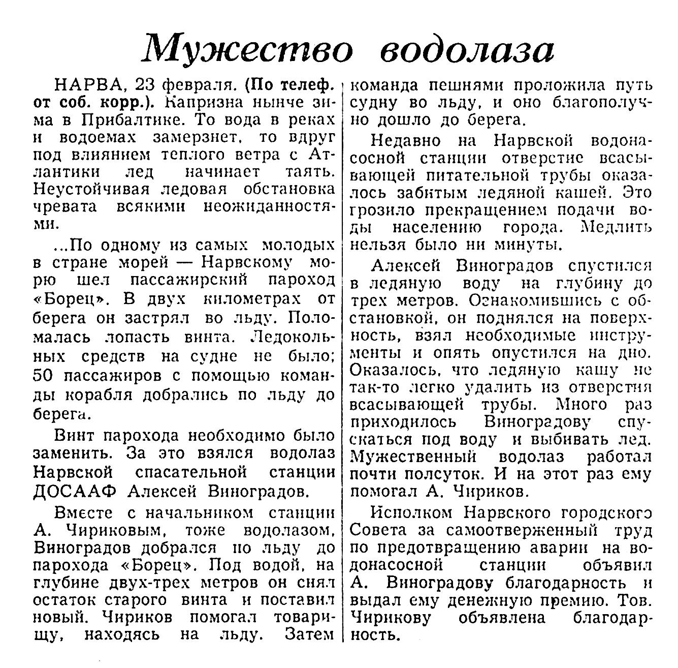 Известия, 1957, № 47 (12354), 24 февраля.Мужество водолазаНАРВА, 23 февраля. (