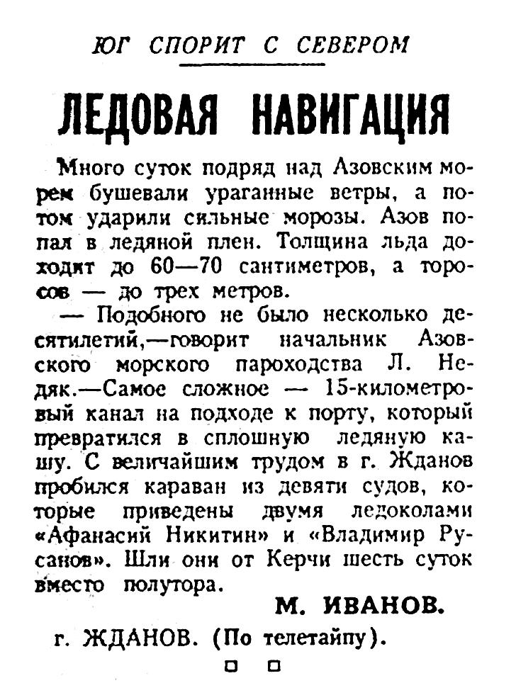 — Подобного не было несколько десятилетий, — говорит начальник Азовского морского пароходства Л. Недяк. — Самое сложное — 15-километровый канат на подходе к порту, который превратился в сплошную ледяную кашу. С величайшим трудом в г. Жданов пробился караван из девяти судов, которые приведены двумя ледоколами «Афанасий Никитин» и «Владимир Русанов». Шли они от Керчи шесть суток вместо полутора.