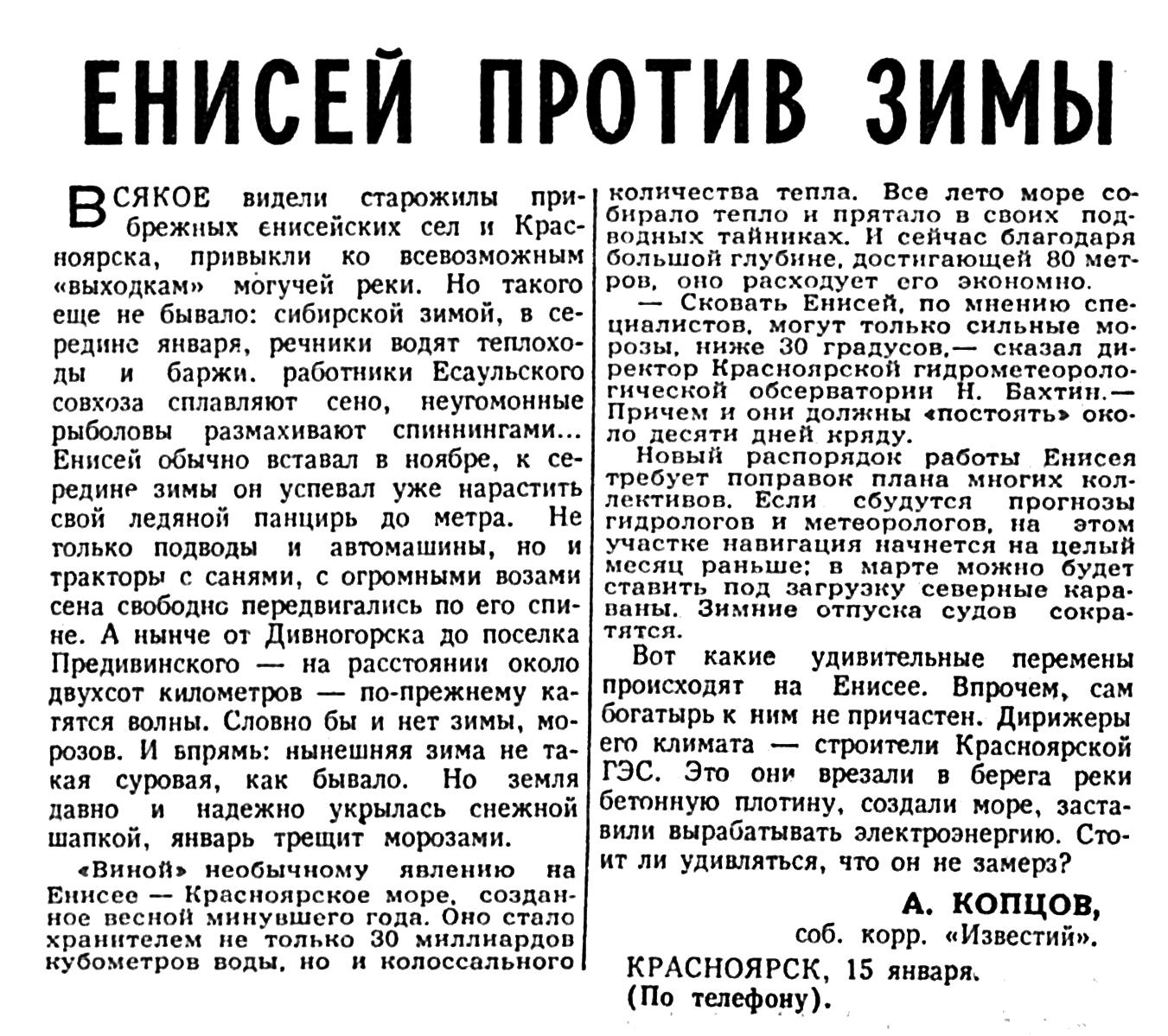 — Сковать Енисей, по мнению специалистов. могут только сильные морозы. ниже 30 градусов. — сказал директор Красноярской гидрометеорологической обсерватории Н. Бахтин. — Причем и они должны «постоять» около десяти дней кряду.