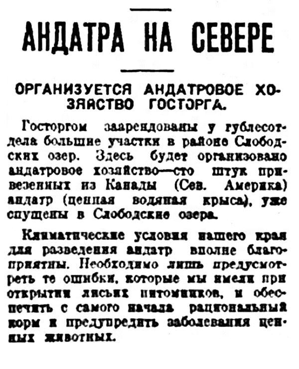 Госторгом заарендованы у гублесотдела большие участки в районе Слободских озер. Здесь будет организовано андатровое хозяйство — сто штук привезенных из Канады (Сев. Америка) андатр (ценная водяная крыса) уже спущены в Слободские озера.