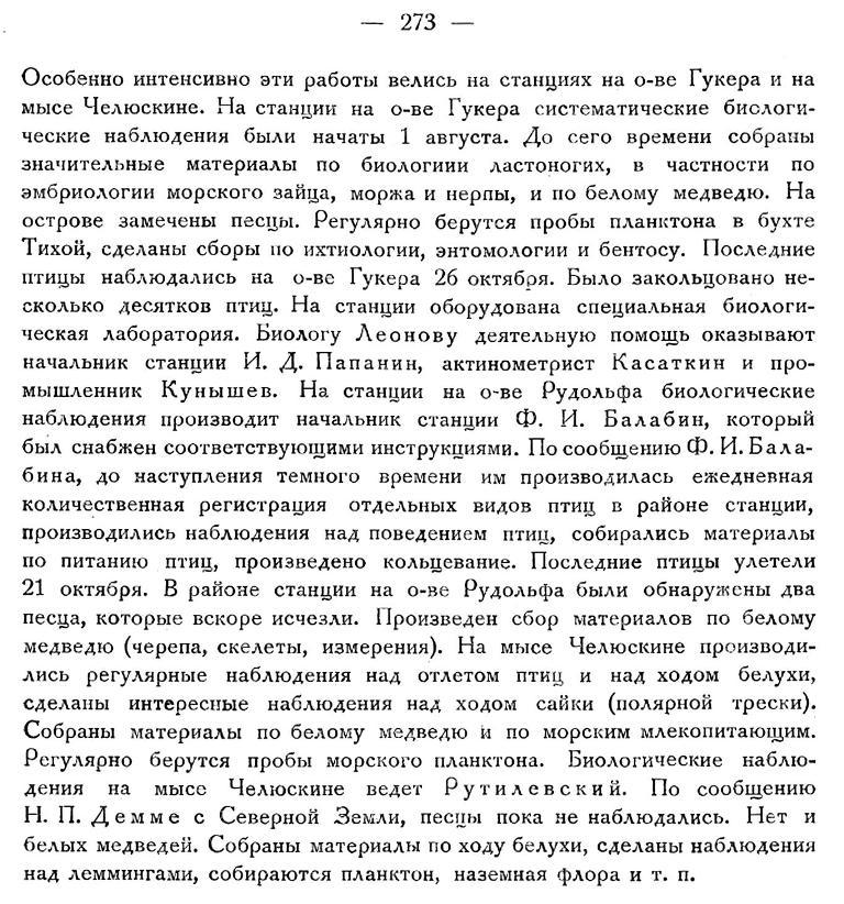 Особенно интенсивно эти работы велись на станциях на о-ве Гукера и на мысе Челюскине. На станции на о-ве Гукера систематические биологические наблюдения были начаты 1 августа. До сего времени собраны значительные материалы по биологии ластоногих, в частности по эмбриологии морского зайца, моржа и нерпы, и по белому медведю. На острове замечены песцы. Регулярно берутся пробы планктона в бухте Тихой, сделаны сборы по ихтиологии, энтомологии и бентосу. Последние птицы наблюдались на о-ве Гукера 26 октября. Было закольцовано несколько десятков птиц. На станции оборудована специальная биологическая лаборатория. Биологу Леонову деятельную помощь оказывают начальник станции И. Д. Папанин, актинометрист Касаткин и промышленник Кунышев. На станции на о-ве Рудольфа биологические наблюдения производит начальник станции Ф. И. Балабин, который был снабжен соответствующими инструкциями. По сообщению Ф. И. Балабина, до наступления темного времени им производилась ежедневная количественная регистрация отдельных видов птиц в районе станции, производились наблюдения над поведением птиц, собирались материалы по питанию птиц, произведено кольцевание. Последние птицы улетели 21 октября. В районе станции на о-ве Рудольфа были обнаружены два песца, которые вскоре исчезли. Произведен сбор материалов по белому медведю (черепа, скелеты, измерения). На мысе Челюскине производились регулярные наблюдения над отлетом птиц и над ходом белухи, сделаны интересные наблюдения над ходом сайки (полярной трески). Собраны материалы по белому медведю и по морским млекопитающим. Регулярно берутся пробы морского планктона. Биологические наблюдения на мысе Челюскине ведет Рутилевский. По сообщению Н. П. Демме с Северной Земли, песцы пока не наблюдались. Нет и белых медведей. Собраны материалы по ходу белухи, сделаны наблюдения над леммингами, собираются планктон, наземная флора и т. п.