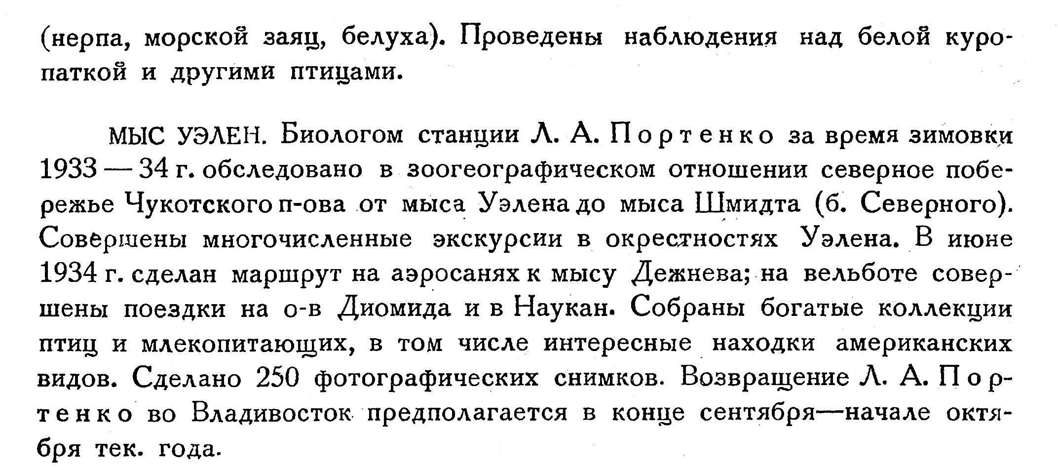 МЫС УЭЛЕН. Биологом станции Л. А. Портенко за время зимовки 1933—34 г. обследовано в зоогеографическом отношении северное побережье Чукотского п-ова от мыса Уэлена до мыса Шмидта (б. Северного). Совершены многочисленные экскурсии в окрестностях Уэлена. В июне 1934 г. сделан маршрут на аэросанях к мысу Дежнева; на вельботе совершены поездки на о-в Диомида и в Наукан. Собраны богатые коллекции птиц и млекопитающих, в том числе интересные находки американских видов. Сделано 250 фотографических снимков. Возвращение Л. А. Портенко во Владивосток предполагается в конце сентября—начале октября тек. года.