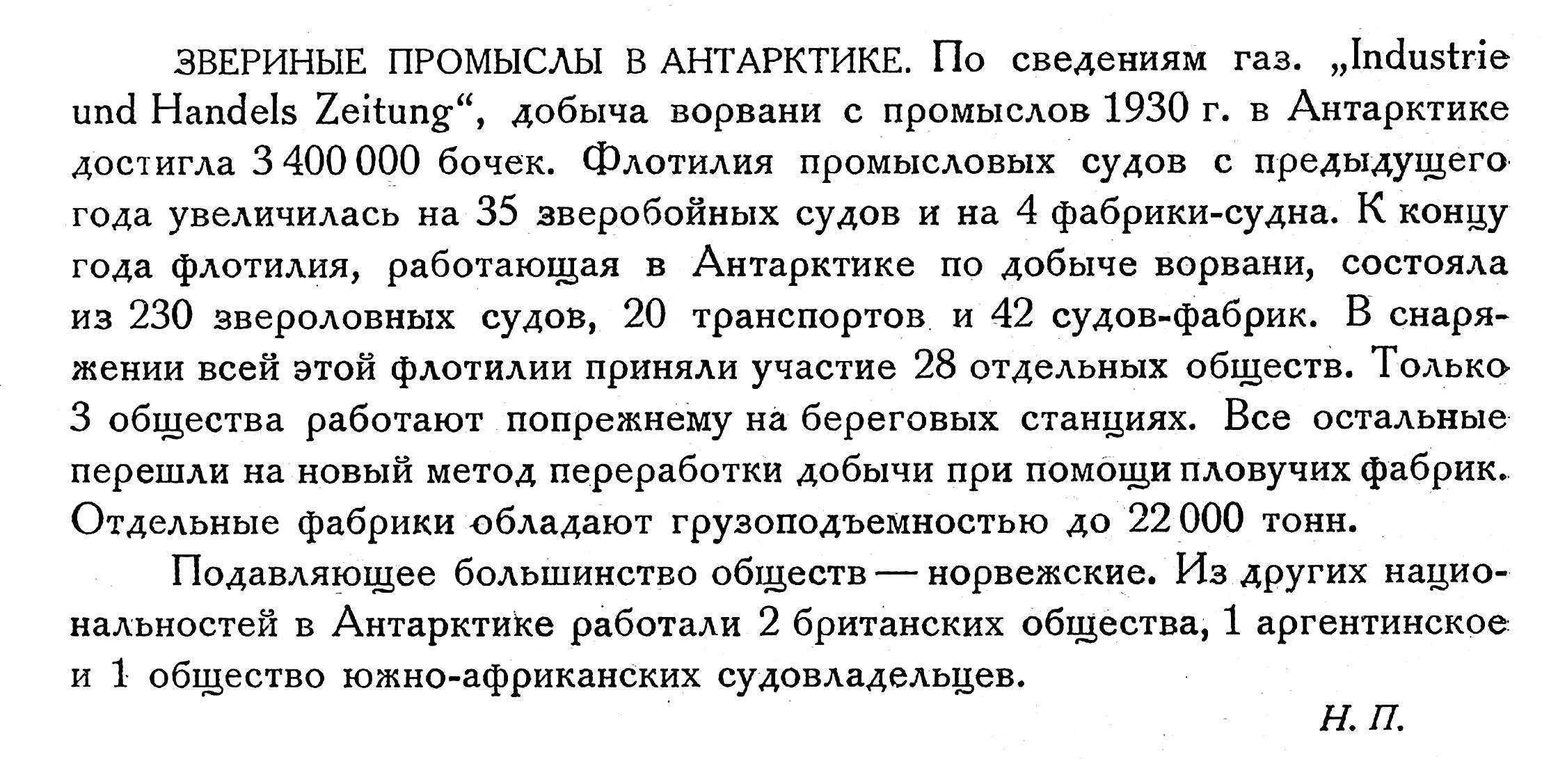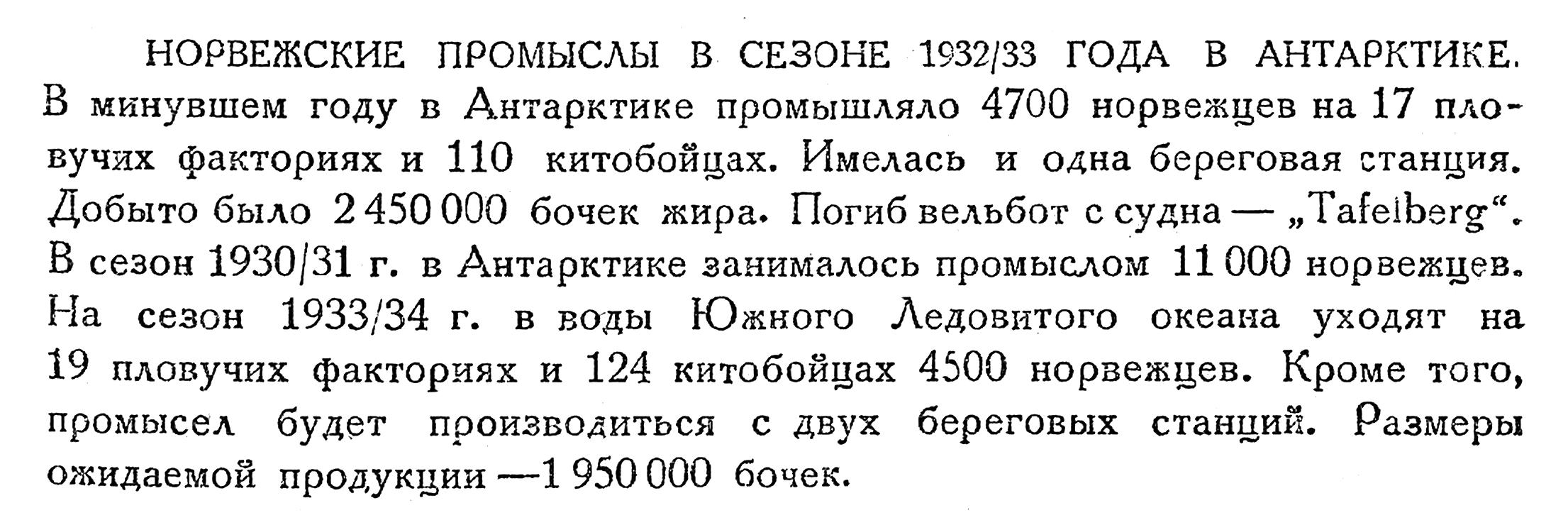 В связи с экономической экспансией существенно улучшились перспективы регулирования китобойного промысла, так как крупные китоловные фирмы вынуждены прибегнуть к планированию промысла, путем объединения своей хозяйственной деятельности. В настоящее время к планированию промысла прибегло и крупнейшее английское общество Сальвезен. Фактически вне объединения китобойных обществ теперь остались только промысловые суда в Южной Америке, Северной Америке, Японии и СССР. В то же самое время при норвежских китопромысловых обществах образовалось товарищество по сбыту, которое также способствует укреплению положения. Однако, несмотря на то, что, попутно с этим, как норвежское правительство, так и китопромысловое объединение производят, для оживления сбыта, научные исследования новых возможностей применения китового жира, все же нельзя рассчитывать на полное использование в течение 1932/33 г. всего наличного флота, если не пойти на новое падение цен на рынке.
