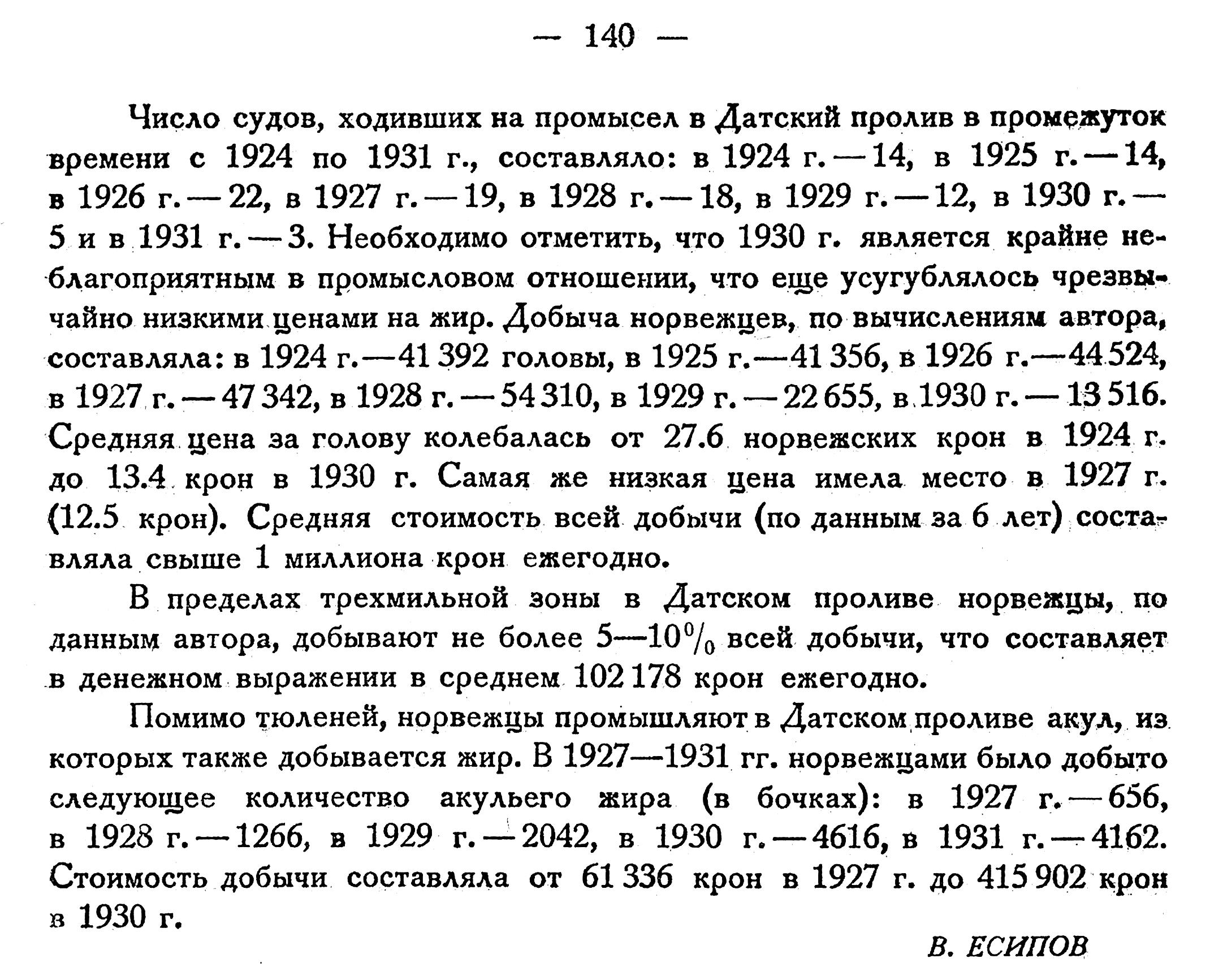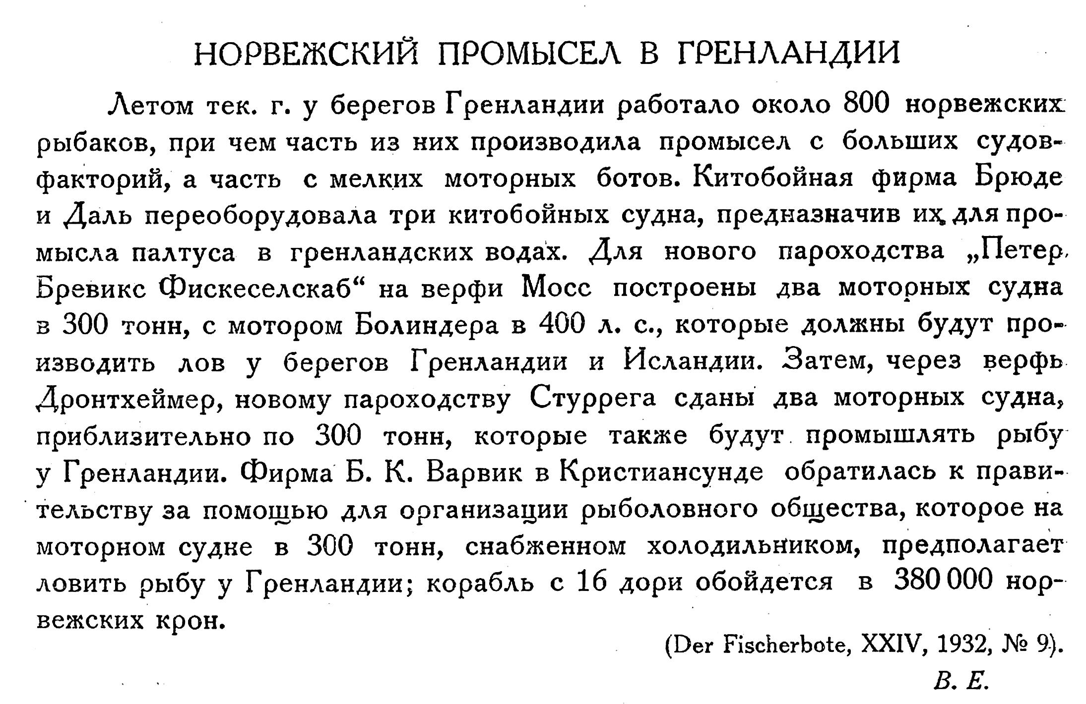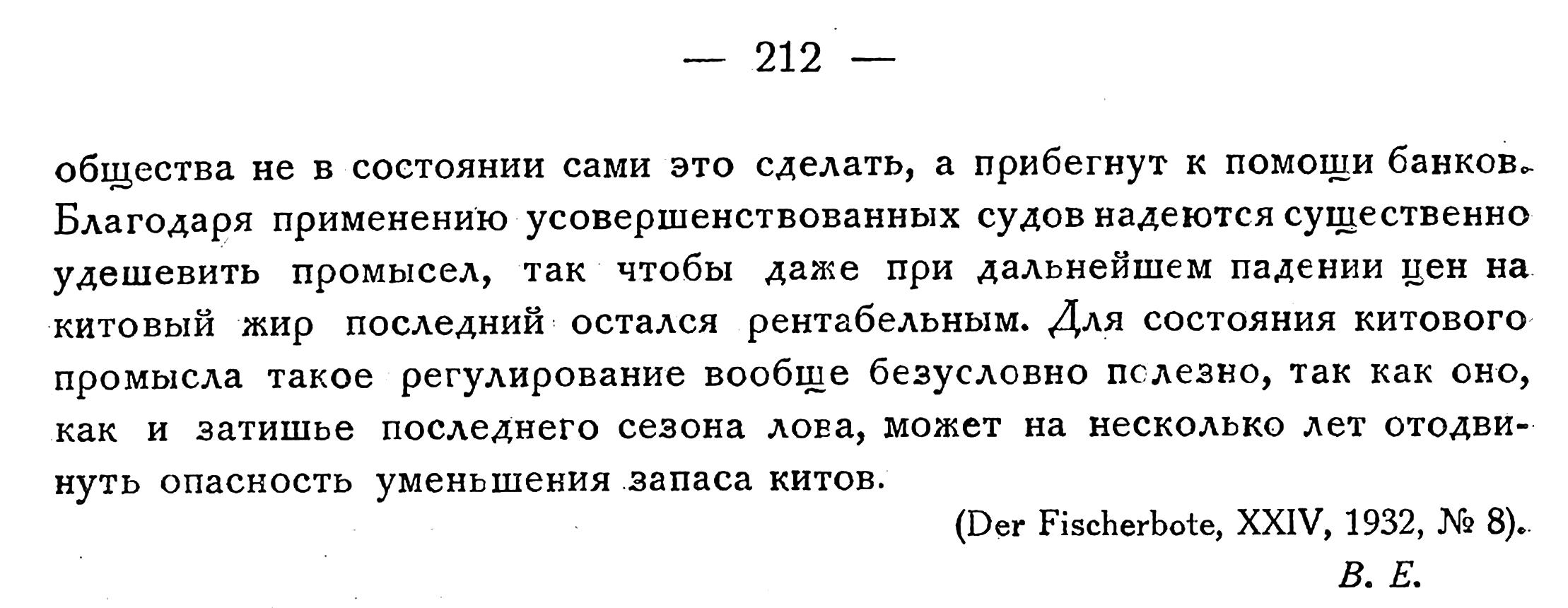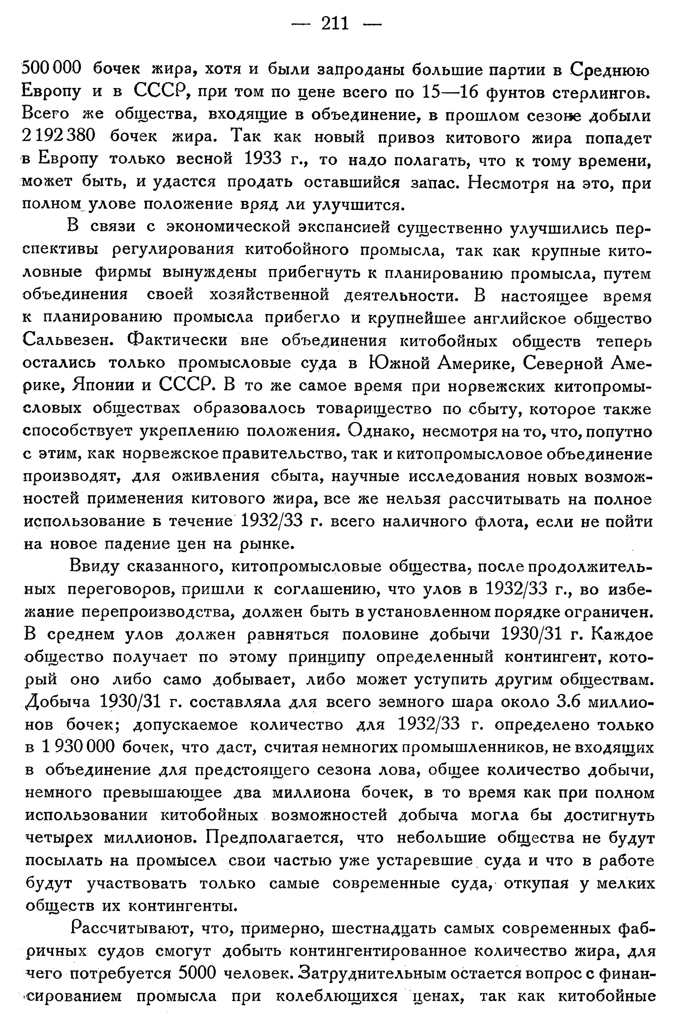 В связи с экономической экспансией существенно улучшились перспективы регулирования китобойного промысла, так как крупные китоловные фирмы вынуждены прибегнуть к планированию промысла, путем объединения своей хозяйственной деятельности. В настоящее время к планированию промысла прибегло и крупнейшее английское общество Сальвезен. Фактически вне объединения китобойных обществ теперь остались только промысловые суда в Южной Америке, Северной Америке, Японии и СССР. В то же самое время при норвежских китопромысловых обществах образовалось товарищество по сбыту, которое также способствует укреплению положения. Однако, несмотря на то, что, попутно с этим, как норвежское правительство, так и китопромысловое объединение производят, для оживления сбыта, научные исследования новых возможностей применения китового жира, все же нельзя рассчитывать на полное использование в течение 1932/33 г. всего наличного флота, если не пойти на новое падение цен на рынке.