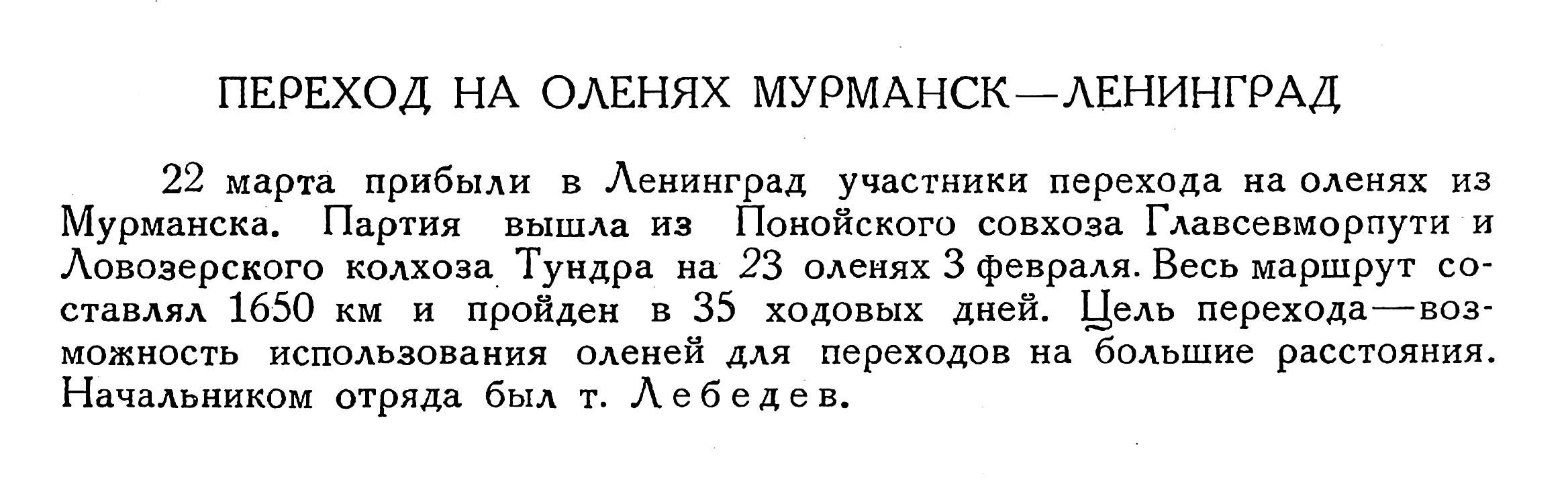 С Кольского п-ова направляются на Чукотку пастухи-оленеводы для внедрения среди колхозников ижемцев и саамов неприменявшихся до сих пор в Чукотском оленеводческом хозяйстве методов пастьбы оленей с помощью собак. Пастухи едут со сворами лаек.
