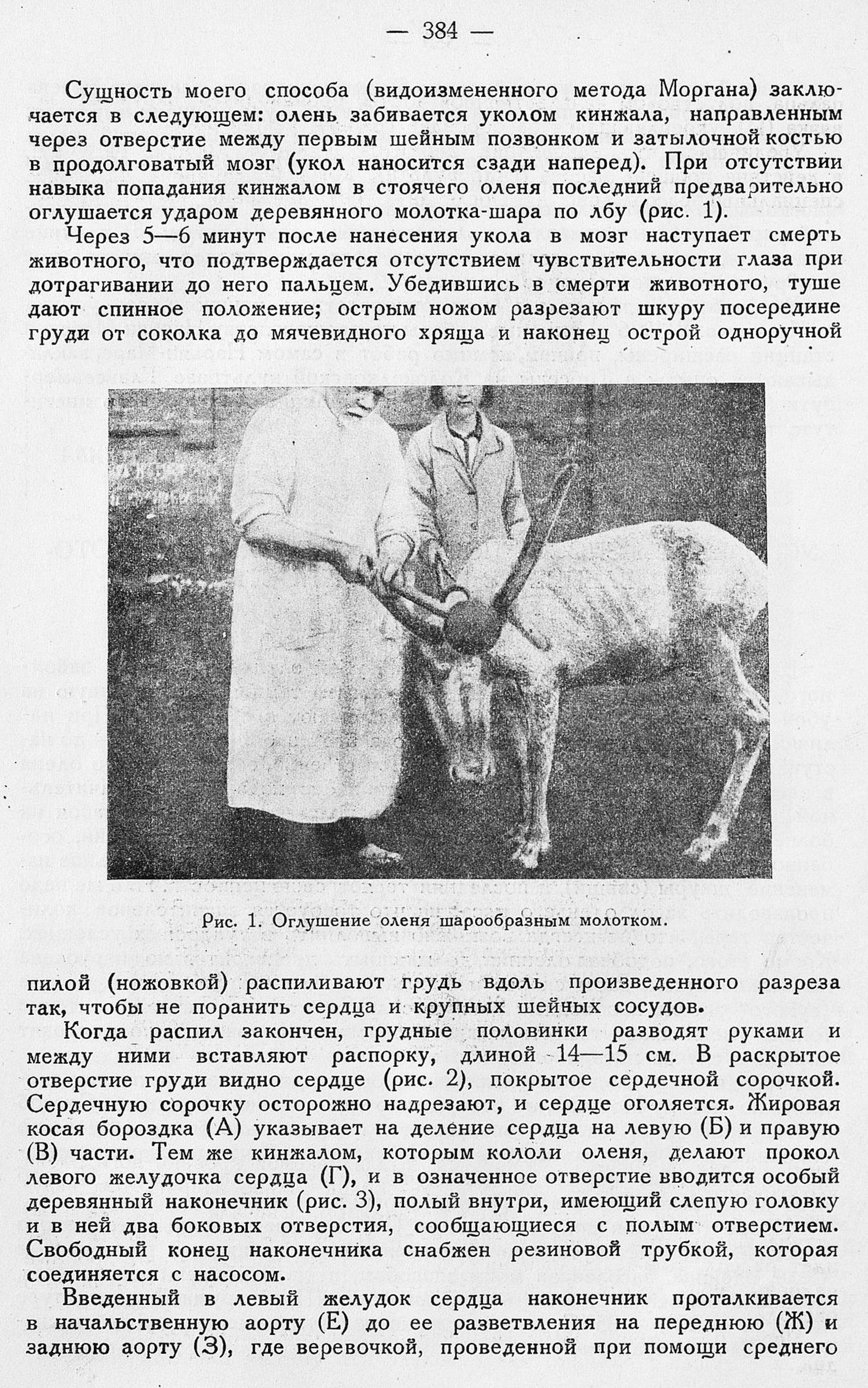 Сущность моего способа (видоизмененного метода Моргана) заключается в следующем: олень забивается уколом кинжала, направленным через отверстие между первым шейным позвонком и затылочной костью в продолговатый мозг (укол наносится сзади наперед). При отсутствии навыка попадания кинжалом в стоячего оленя последний предварительно оглушается ударом деревянного молотка-шара по лбу (рис. 1).