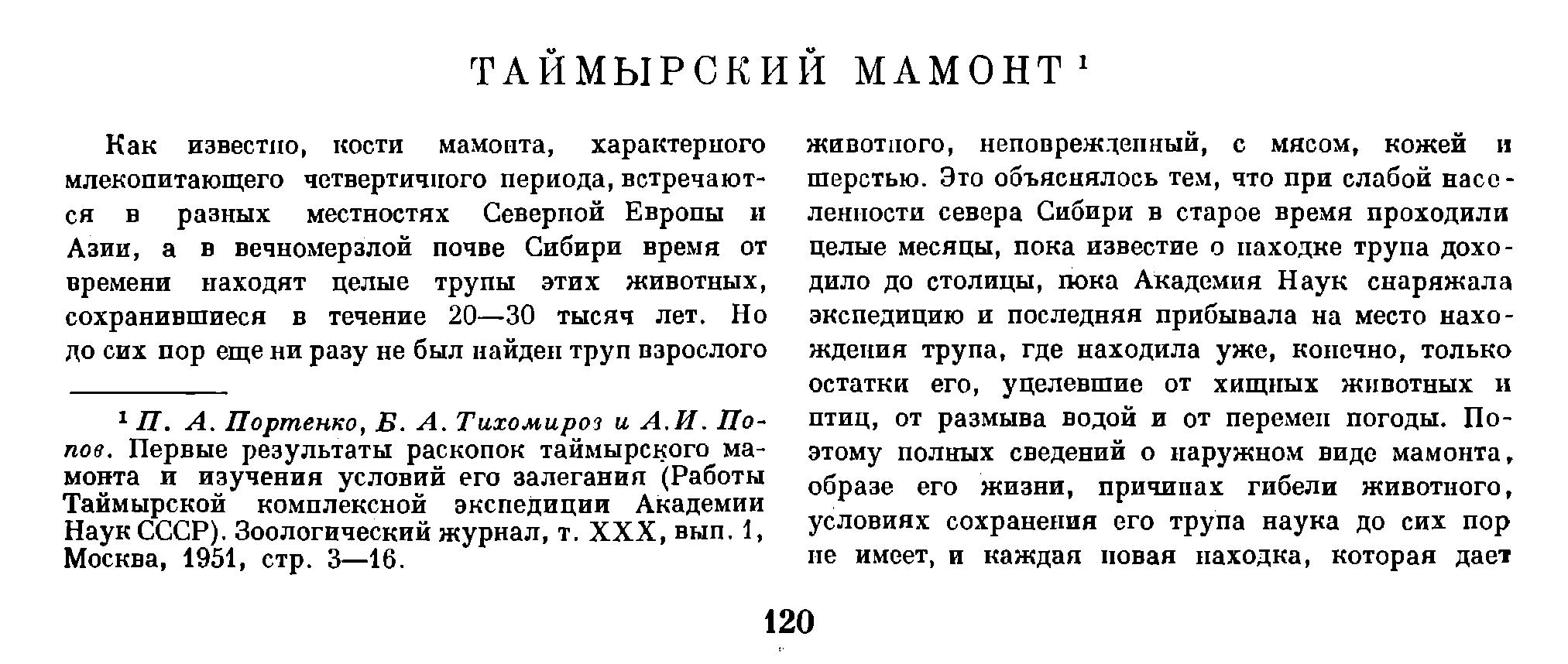 1) П. А. Портенко, В. А. Тихомиров и А. И. Попов. Первые результаты раскопок таймырского мамонта и изучения условий его залегания (Работы Таймырской комплексной экспедиции Академии Наук СССР). Зоологический журнал, т. XXX, вып. 1, Москва, 1951, стр. 3—16.