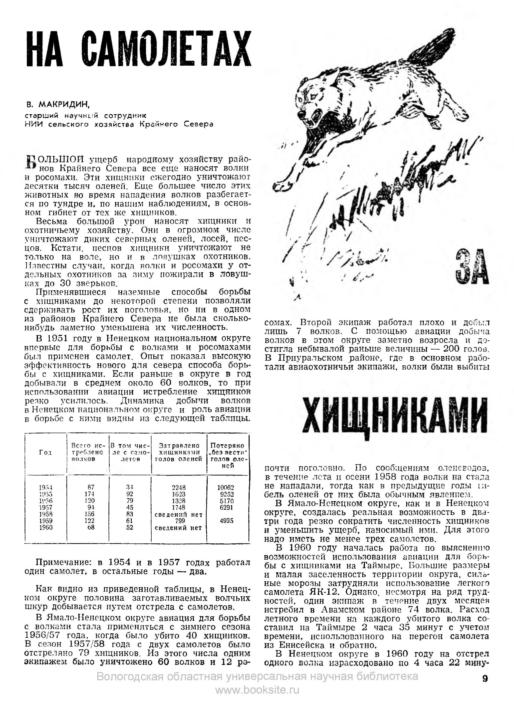 Один из организаторов этого дела В. Макридин в своей книге «Использование самолета для борьбы с волками», изданной в Архангельске в 1955 г., пишет;