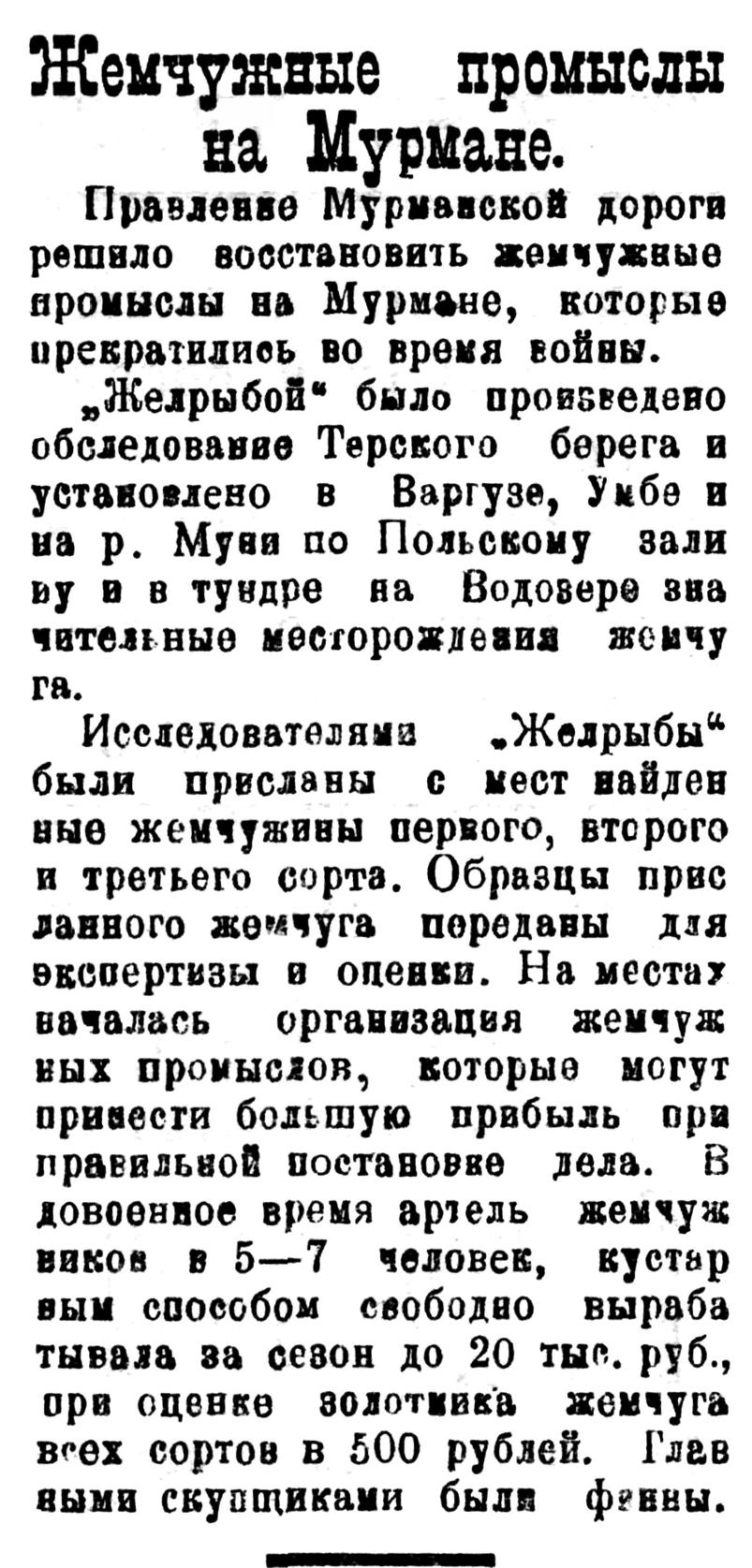Герб города изображает щит, в верхней части которого находится губернский герб, а в нижней, в голубом поле, венок из жемчуга. Это последнее обстоятельство немаловажно и не потеряло своего значения и до сих пор. В порожистой, быстрой и местами чрезвычайно мелкой реке Кеми попадаются жемчужные раковины, хотя лов их и не составляет исключительного занятия всех жителей, но даже и одного какого-нибудь семейства. Жемчуг этот ловят от безделья досужие люди и не всегда для продажи, потому что здешний жемчуг невысокой доброты и попадается в реке в незначительном количестве. Иногда целый день терпеливые люди роются в воде и достают много горсть, чаще три-четыре зернышка. Ловля эта обыкновенно производится следующим простым способом. Искатели садятся на бревенчатый плот небольшой, с отверстием в середине, заставленным трубой. Большая часть трубы этой находится в воде. Один, по берегу, тянет плотик, другой смотрит через трубу в воду. Заметив подле камня раковину, имеющую сходство с жемчужною (обыкновенно, при ясной солнечной погоде, когда животное открывает раковину) наблюдатель опускает через трубу длинный шест с щипчиками или крючком на одном конце его. Раковина смыкается и тогда ее удобно бывает принять на щипчики. Разломивши раковину, счастливец, нашедший зернышко, обязан немедленно положить его за щеку для той цели, чтобы это зернышко — отложение болезненного процесса улитки (как объясняют обыкновенно зарождение жемчуга) — через прикосновение со слюною, делалось из мягкого постепенно твердым, до состояния настоящего жемчуга (обыкновенно через 6 часов, как замечают). Точно так же (замечают поморы) жемчуг водится во всех реках, куда любит в избытке заходить семга, и что между этой породою рыб и слизняком существует какая-то темная, загадочная, труднообъяснимая симпатия. Ловится жемчуг и в других поморских реках, кроме Кеми, как, например, в Жемчужной губе, около Княжьей губы, около Колы. Но и кемляне, как и все остальные поморы, не дают этой отрасли промыслов особенной доли участия и внимания, кладя всю жизнь, находя всю цель исключительно в рыбных и звериных промыслах, в судостроении и торговле.