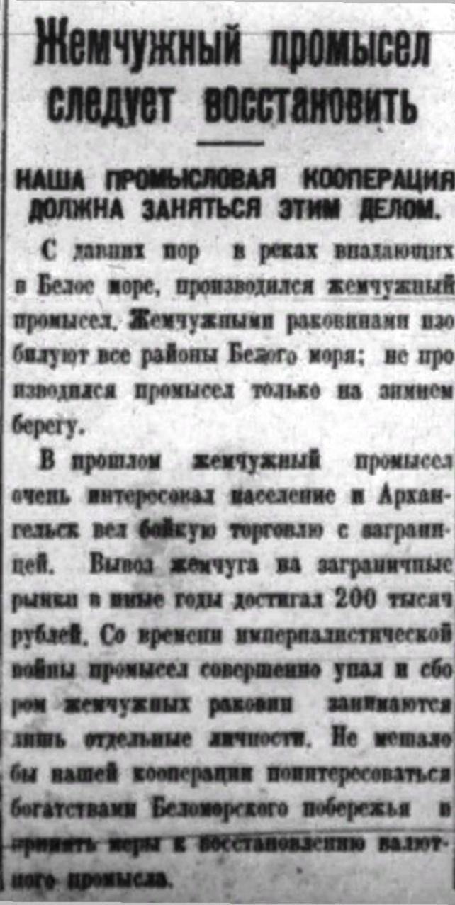 В прошлом жемчужный промысел очень интересовал население и Архангельск вел бойкую торговлю с заграницей. Вывоз жемчуга на заграничные рынки в иные годы достигал 200 тысяч рублей. Со времени империалистической войны промысел совершенно упал и сбором жемчужных раковин занимаются лишь отдельные личности. Не мешало бы нашей кооперации поинтересоваться богатствами Беломорского побережья и принять меры к восстановлению валютного промысла.