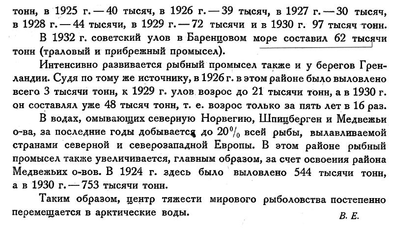 В 1932 г. советский улов в Баренцовом море составил 62 тысячи тонн (траловый и прибрежный промысел).