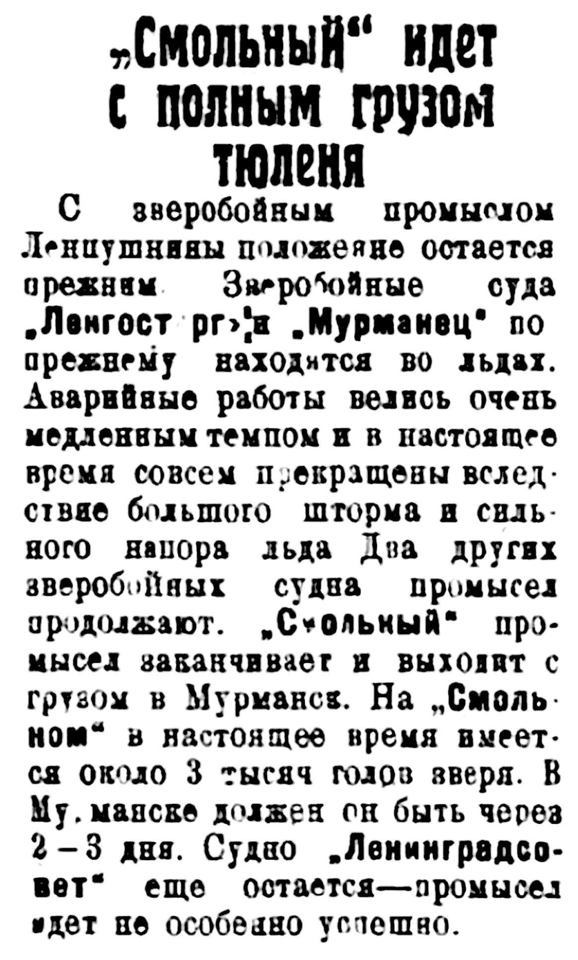 С зверобойным промыслом Ленпушнины положение остается прежним. Зверобойные суда "Ленгосторг" и "Мурманец" по прежнему находится во льдах. Аварийные работы велись очень медленным темпом и в настоящее время совсем прекращены вследствие большого шторма и сильного напора льда. Два других зверобойных судна промысел продолжают. "Смольный" промысел заканчивает и выходит с грузом в Мурманск. На "Смольном" в настоящее время имеется около 3 тысяч голов зверя. В Мурманске должен он быть через 2-3 дня. Судно "Ленинградсовет" еще остается — промысел идет не особенно успешно.